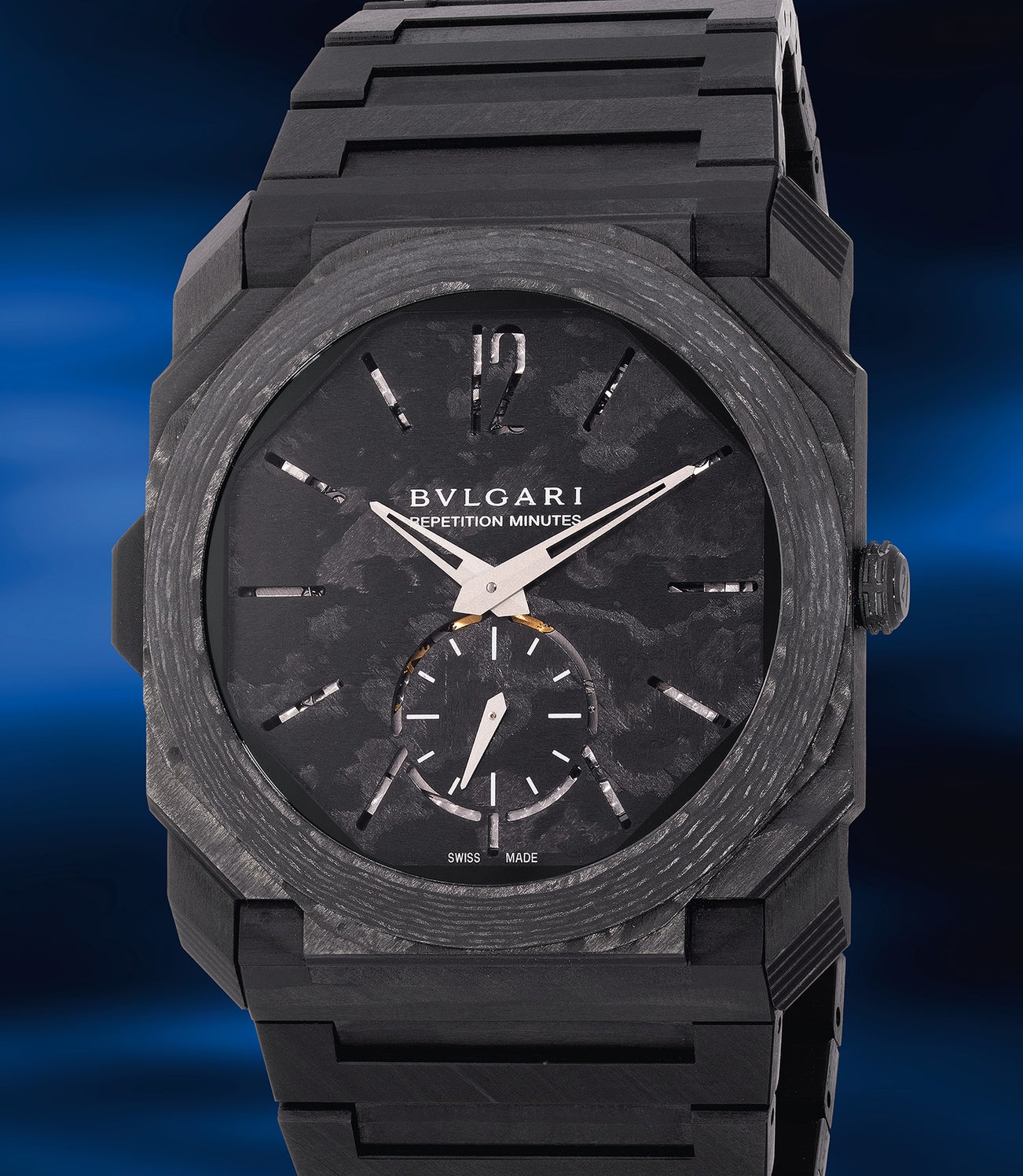 The original Octo Finissimo Minute Repeater saw the light of day for the first time in 2016, and it was then the thinnest minute repeater in the world – inside is the stunning BVL 362 movement, measuring just 2.23mm in thickness while boasting an impressive 60-hour power reserve. In 2018, Bulgari stunned the watch community yet again with this present limited edition, the Minute Repeater Carbon. Housed in an extremely lightweight carbon case, this Octo Finissimo is a rare limited edition of just 50. This Octa Finissimo utilizes Carbon Thin Ply (CTP) which is essentially a thermo-setting epoxy resin reinforced with carbon fiber.