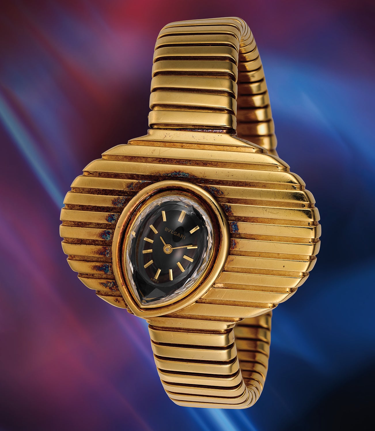 Iconic design is deemed as such because it is instantly recognizable; however, this example of the Tubogas is a bit more difficult to pinpoint. It has the typical Tubogas shape for the bracelet, but a relatively immense oval-shaped plaque bearing the pear-shaped watch head suspended, slightly off-center. Other such sculptural renditions of the Tubogas have been seen, such as a fan-shaped wrap bracelet example now housed in the Bulgari archives.
