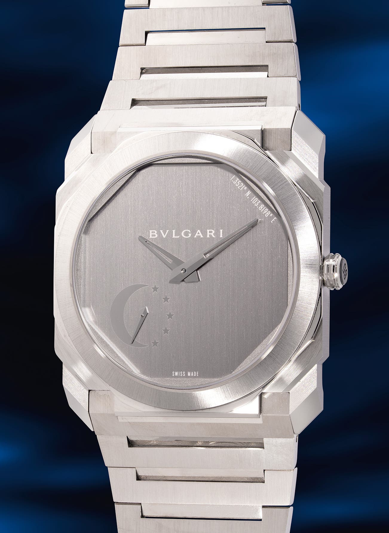 An attractive, rare and “brand-new” limited edition ultra-thin stainless steel wristwatch with small seconds, silvered dial, bracelet, warranty and presentation box, one of limited edition of 30 pieces made in collaboration with The Octo Club Singapore