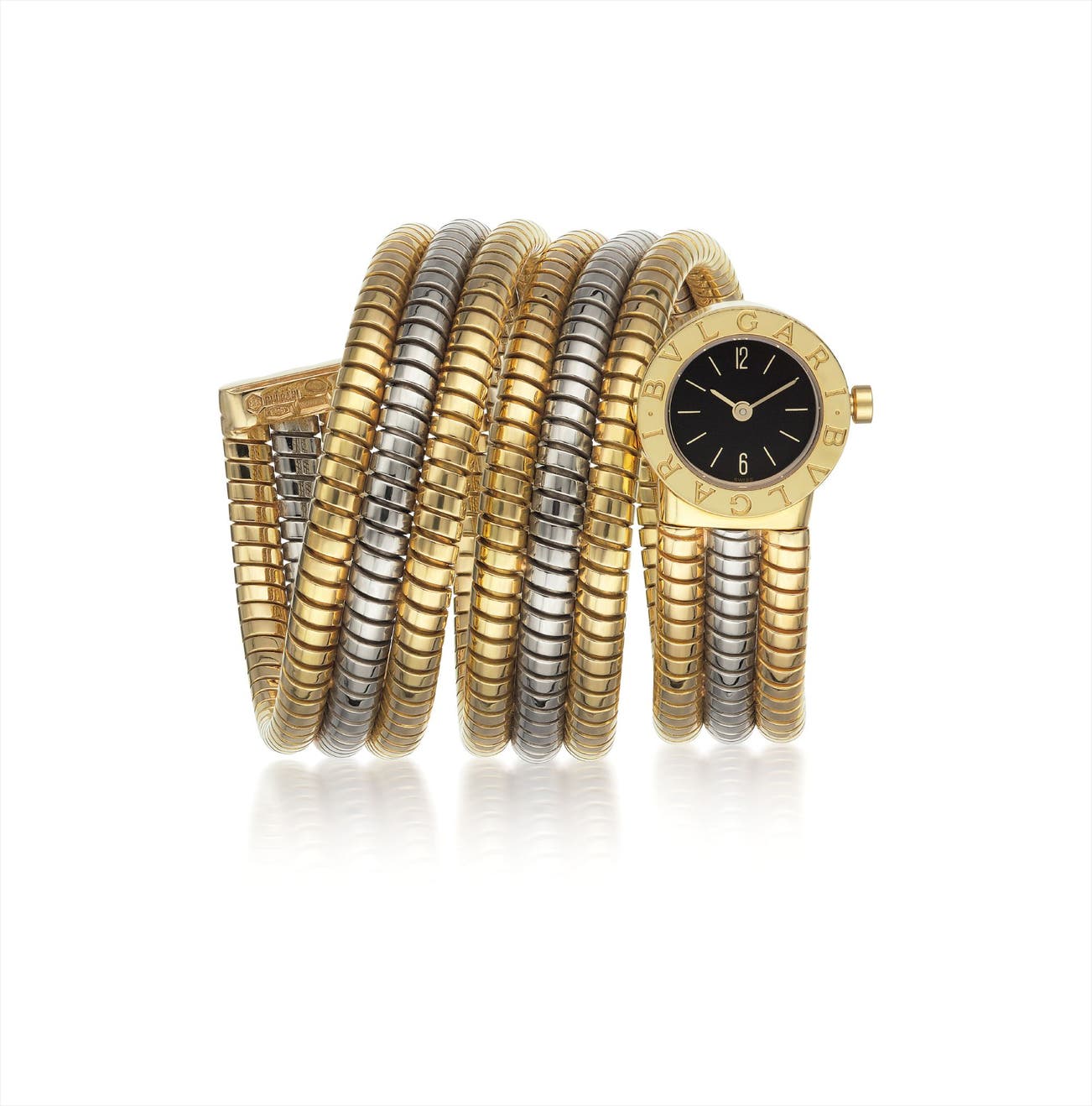 In 1884, Bulgari opened its doors to the Italian people with its offering of jewelry and accessories. Bulgari's style takes from traditions in Greek and Roman craftsmanship to elegantly balance volume and subtlety. Later, in the late 1960s, Bulgari bridged classicism and modernity by introducing its seductive, now-iconic Serpenti collection of snake-shaped coil bracelets and watches. It is through its meticulous combination of influences that Bulgari has garnered an international and loyal high-profile clientele, which included Elizabeth Taylor and Audrey Hepburn. These Hollywood stars have immortalized the house's unique gem-adorned bracelets, necklaces and earrings in rounded forms.