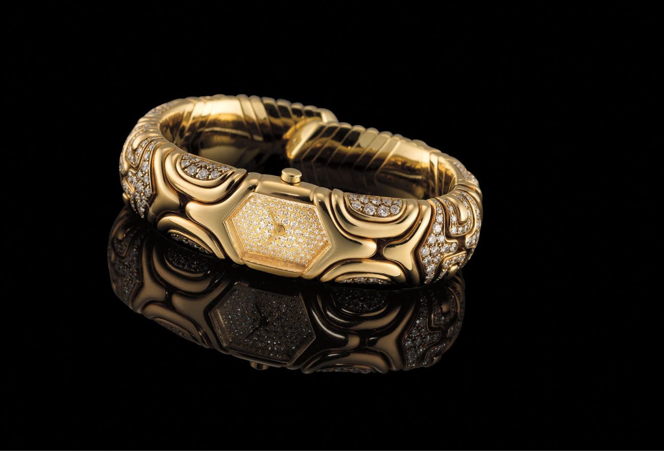 In 1884, Bulgari opened its doors to the Italian people with its offering of jewelry and accessories. Bulgari's style takes from traditions in Greek and Roman craftsmanship to elegantly balance volume and subtlety. Later, in the late 1960s, Bulgari bridged classicism and modernity by introducing its seductive, now-iconic Serpenti collection of snake-shaped coil bracelets and watches. It is through its meticulous combination of influences that Bulgari has garnered an international and loyal high-profile clientele, which included Elizabeth Taylor and Audrey Hepburn. These Hollywood stars have immortalized the house's unique gem-adorned bracelets, necklaces and earrings in rounded forms.