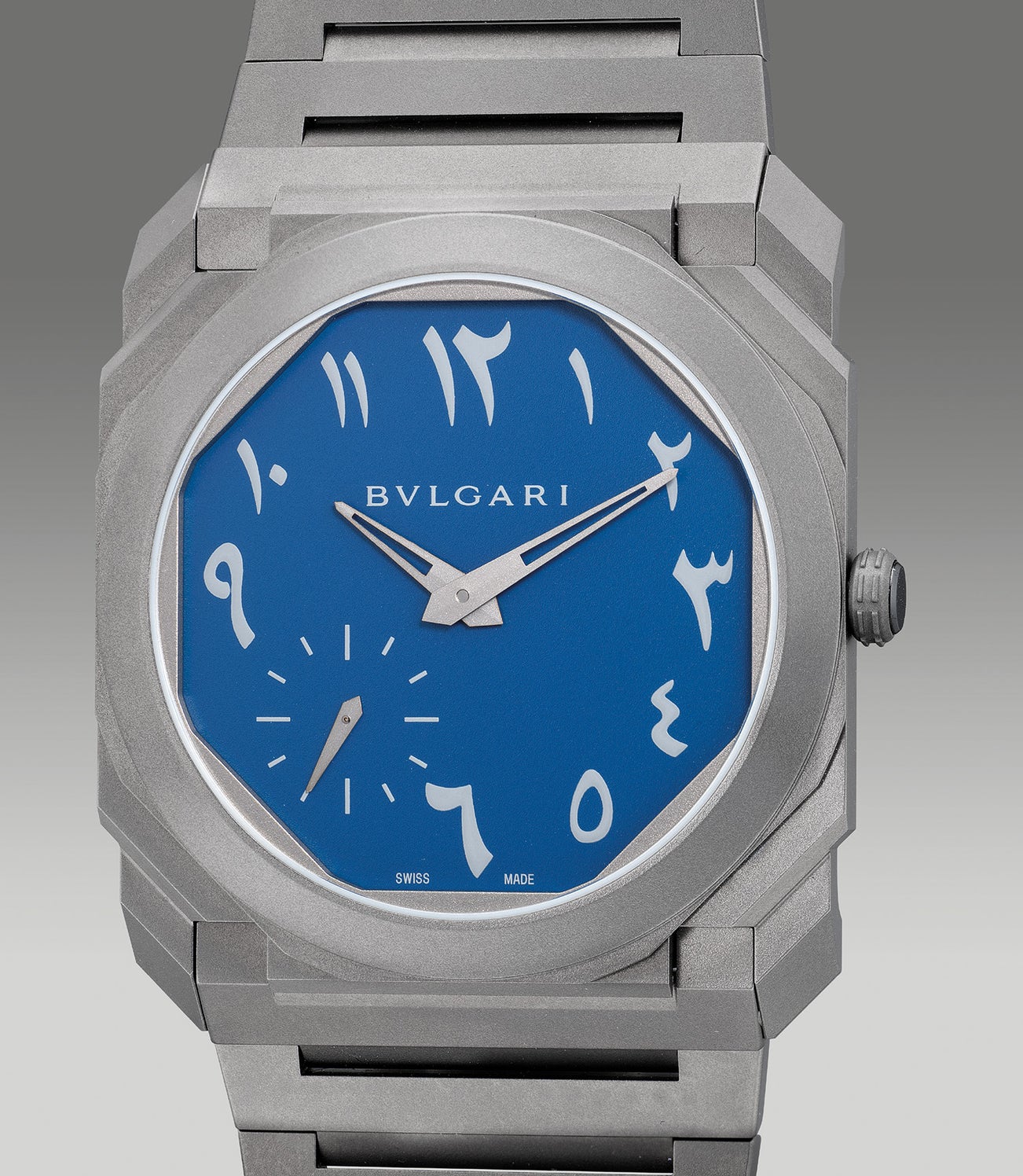 Made only for the Middle Eastern market, the present example is a rare delight featuring a mesmeric ocean blue dial adorned with grey lacquered Eastern Arabic numerals. Offered in “like new” overall condition and complete with its full set of accessories, the Genta inspired timepiece will surely garner interest from collectors worldwide.