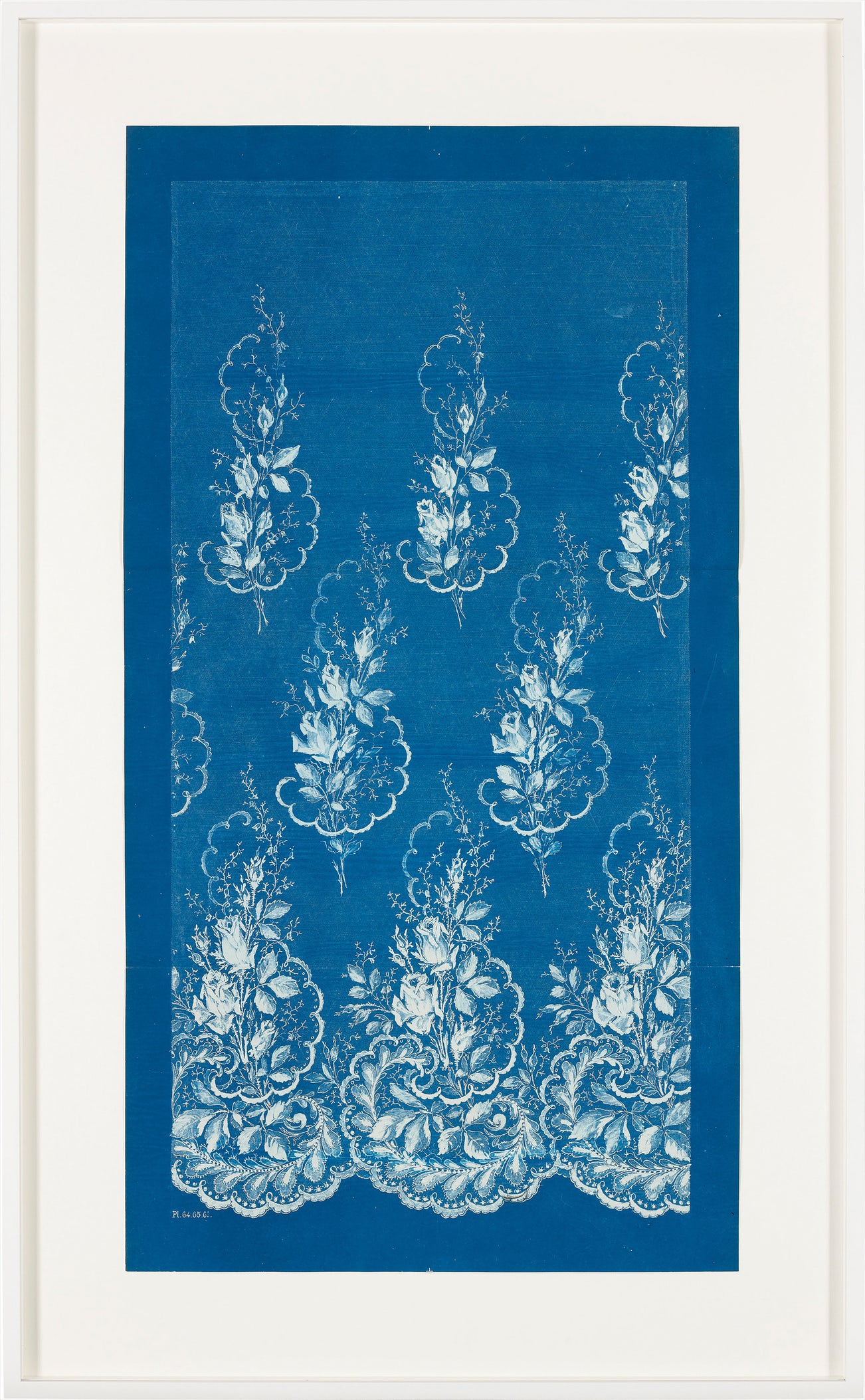 In the late 19th Century, Calavas Frères published several folios and books of photographs for artists’ reference, notably figure studies by Louis Igout. The firm also produced books relating to textiles, including lace, leather, and blinds. The present cyanotype photogram was originally published within a lavish album of lace samples. The exceptional scale of this work distinguishes it from other smaller examples. A slightly smaller cyanotype from the same album is held in the collection of the Museum of Fine Arts, Houston.
