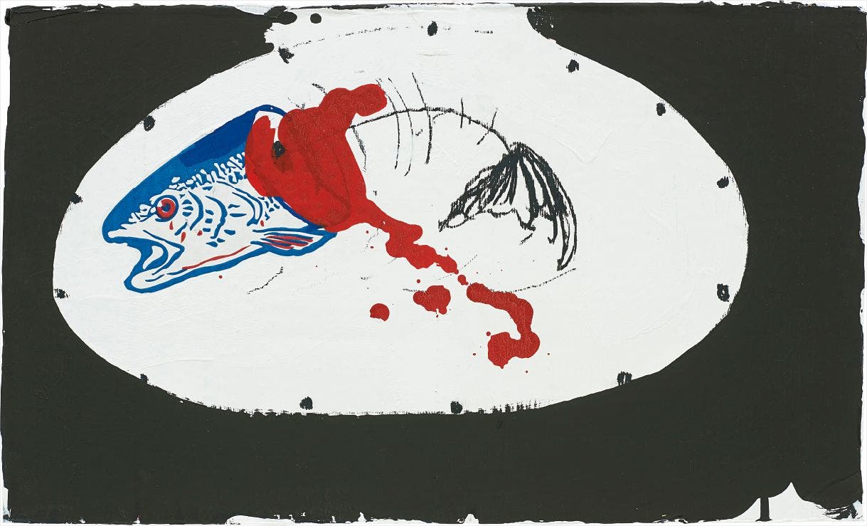 liquid watercolour, water soluble wax, vinyl paint, oil crayon and gesso on printed cardboard