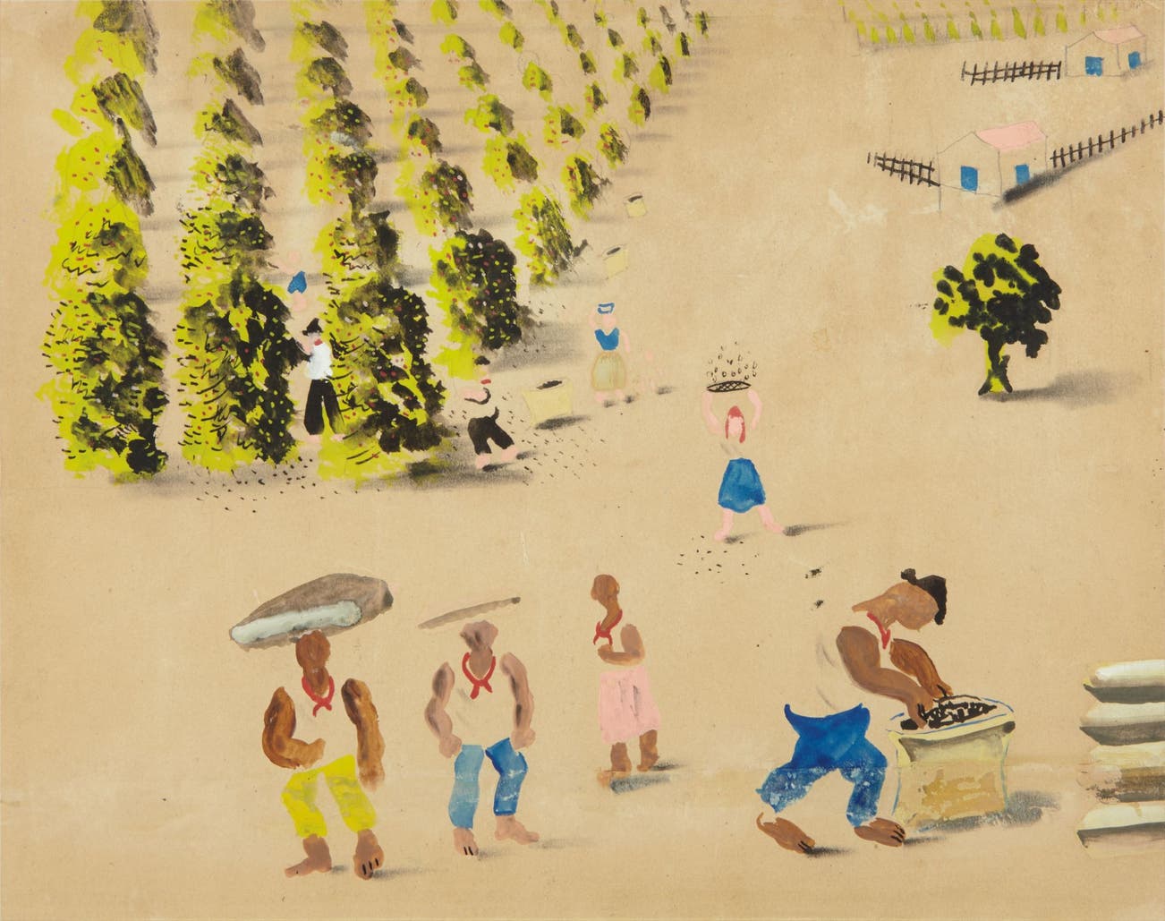 Cândido Portinari is considered one of Brazil’s most important neo-realist painters. He was born in Santa Rosa, a small town in the outskirts of São Paulo known for its coffee plantations. At an early age Portinari became the assistant to an artist commissioned to decorate the local church. Recognizing the young painter’s natural ability, the older artist persuaded Portinari’s parents to send him to the National School of Fine Arts in Rio de Janeiro, where he enrolled at the age of 15. During this time Portinari produced an important body of work that eventually earned him a scholarship to study in Paris in 1928. While in Europe, Portinari absorbed the many artistic styles he experienced, from Renaissance frescoes to Picasso’s Cubism. Interestingly, during this time he scarcely produced any works, for which he was harshly criticized, and in 1930 he returned to Brazil. In 1933, Portinari returned to his birthplace and began an incredibly prolific and pivotal moment in his career. The present lot, Colheita de Café (Coffee Harvest), circa 1933, alludes to a subject matter he would continually explore throughout his oeuvre: life in the land of coffee plantations. Although Portinari depicts the landscape and workers in poverty, his paintings do not emanate a feeling of misery or hardship, but rather depict a faithful representation of the world through his own pictorial style. The rounded bodies impress on us a physicality the artist’s innate understanding of volume – somewhat reminiscent of the Diego Rivera’s mural figures – with somber hues that subtly dramatize the nature of the scene.