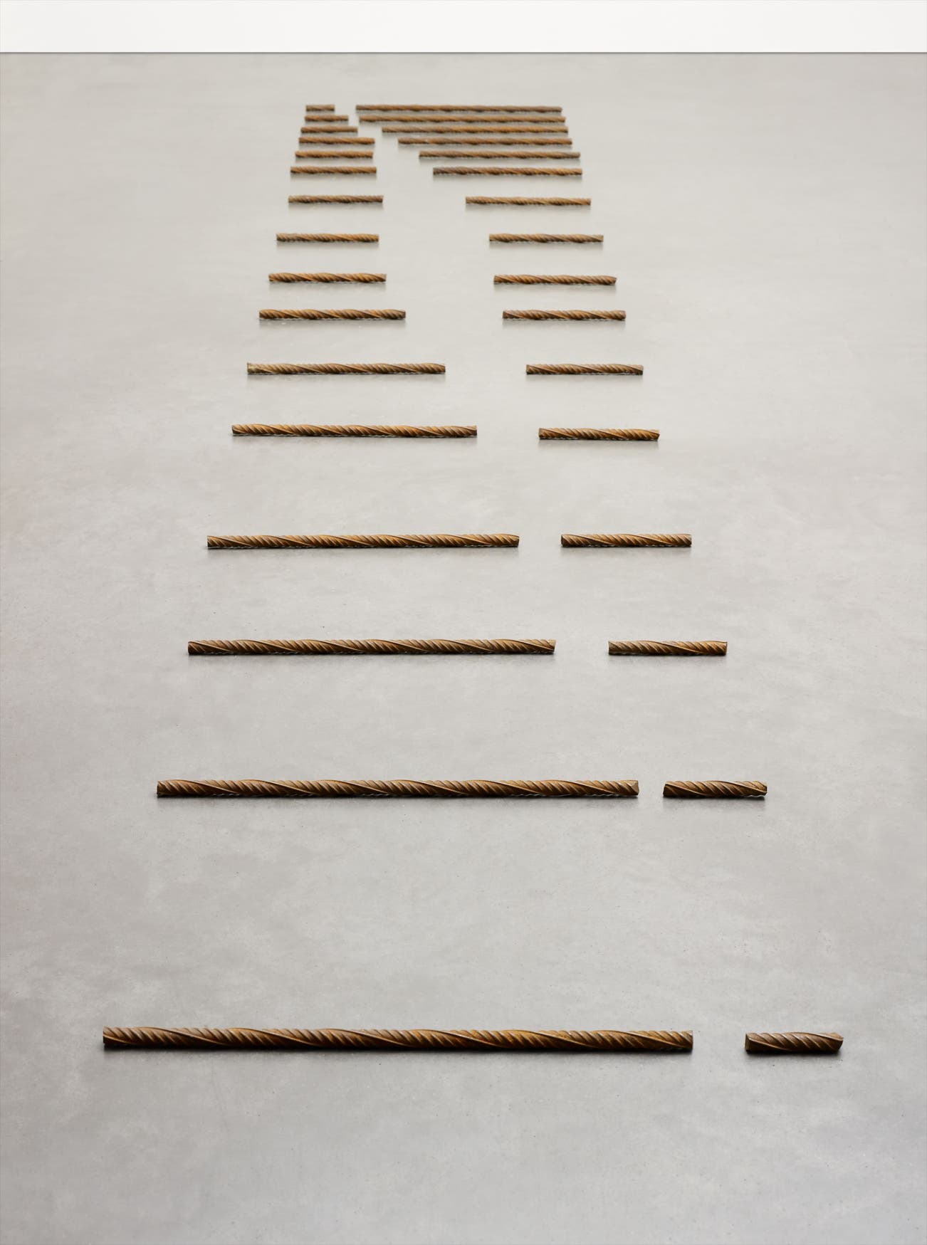 The present lot, 32-Part Reciprocal Invention (RS 1971-20) is a powerful example of the artist’s “invention” in space. Composed of 32 steel reinforcing rods, the sculpture has specific installation instructions as to how it should be disposed and arranged on the floor. But the spaces occupied by this work have varied ever so slightly in visual form each time it has been installed. Within the present lot, the steel rods sit gracefully with their cyclical shapes, as though they have just moments ago rolled into their destined positions. Each of the 32 elements is positioned with certain measured intervals between them; the intervals between the parallel rows are determined reciprocally by the length of the rods themselves. The work both adapts to its environment, to the space to which the artist has assigned it, and yet it also alters and defines its surrounding environment. 32-Part Reciprocal Invention implies a temporal process between presence and absence. As critic Barbara Rose has noted, “The central feature of Andre’s sculpture is not permanence but imminence: They exist in the present as sculptures, but suggest both a past and future state of being disassembled.”(B. Rose, “The Nature of Carl Andre,” The Brooklyn Rail, July – August, 2014)