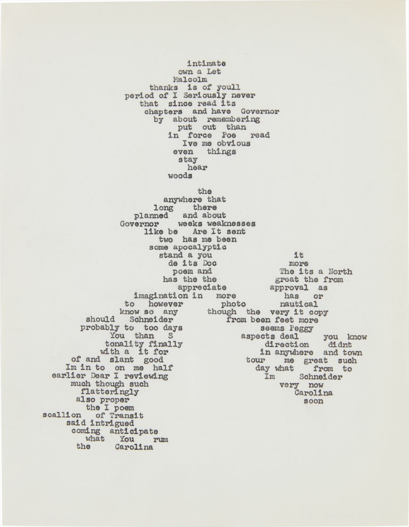 In contrast, Intimate from a few years later is less defined by its content and more by its visual structure. Composed of a walking man made out of a sequence of nonsensical words, Intimate rejects the regularity of Minimalist shapes and forms while still retaining a visual balance and simplicity. The work was illustrated on the cover of ArtForum’s Summer 2013 issue, with an accompanying article written by Gavin Delahunty, featuring 12 of Andre’s poems including the present lot, all published for the first time. Delahunty argues that Andre’s poetry should not be considered a complement nor directly influenced by Andre’s sculpture, but rather as masterworks in their own right which explore both the visual and the literary. As he aptly espouses “Andre’s poems exist in a tantalizing space somewhere between the established categories and forms of poetry and those of sculpture; as such, their status remains uncertain” (Gavin Delahunty, “Carl Andre: Poems” in ArtForum, vol. 51, no. 10, Summer 2013, p. 283). Indeed, both of the present lots poignantly illustrate Andre’s poems as a crucial series of works within his artistic exploration of the complexity of compositional structures.