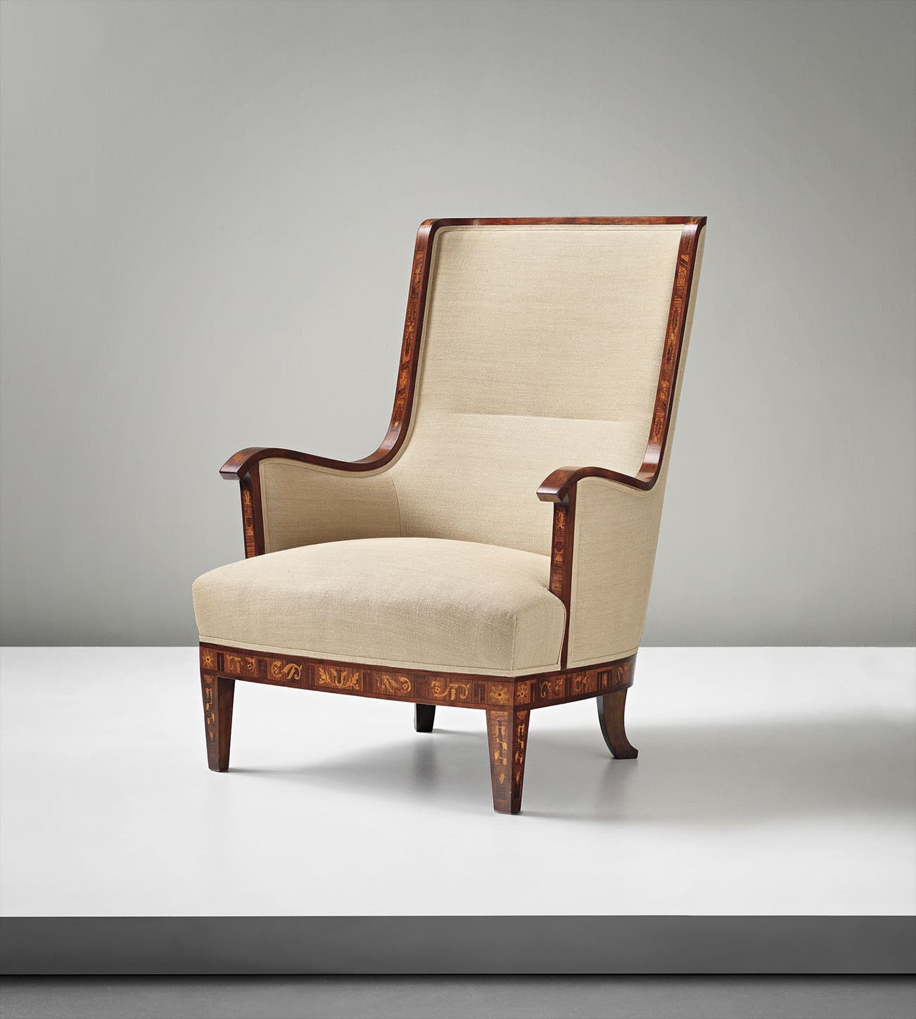 Rosewood-veneered wood and fruitwood marquetry, rosewood, fabric.
