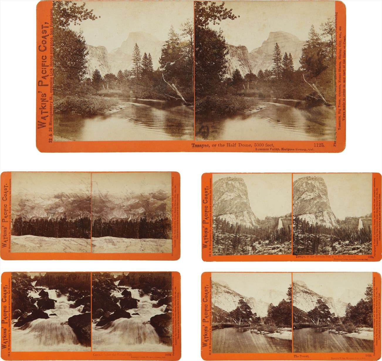 Each credited 'Watkins' Pacific Coast' with printed description and five with printed title, negative number, all on the mount; two titled in an unidentified hand in pencil on the reverse of the mount.
