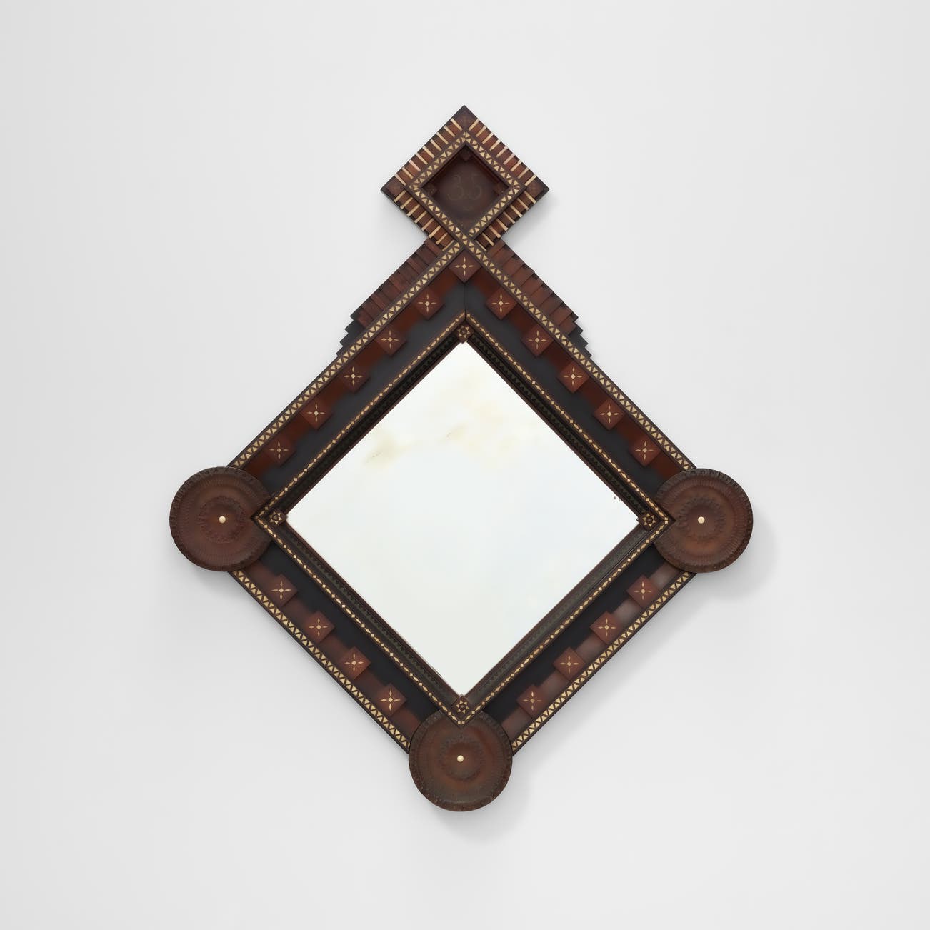 Walnut, stained wood, pewter and brass inlay, copper, bone, mirrored glass.