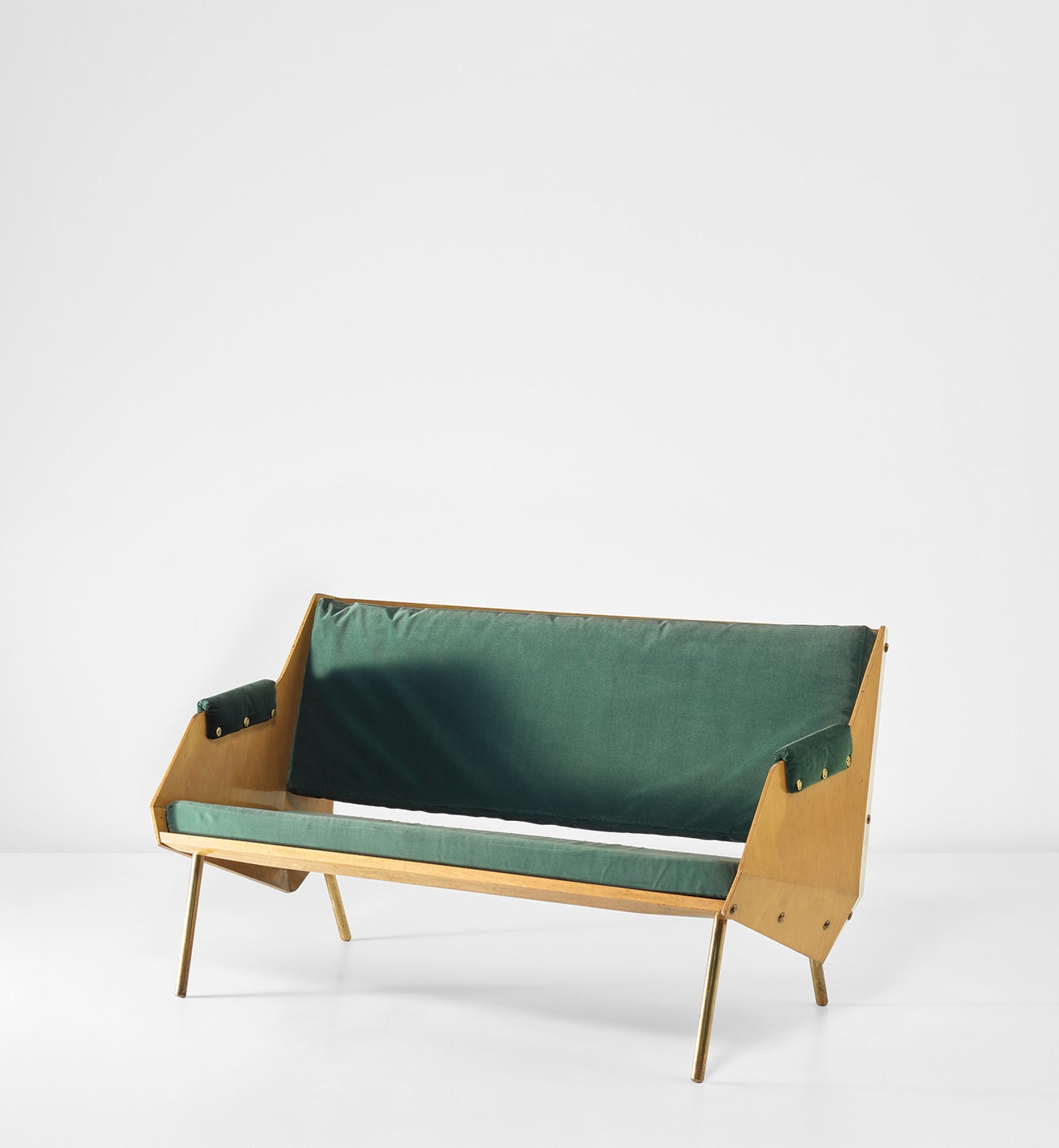 The present settee comprised part of the interiors designed by the architect Carlo de Carli for Casa Galli, Milan in the early 1950s. For the apartment, de Carli conceived a multifunctional space in which to work, dine and relax. One end of the room was covered in rosewood wall panels and illuminated by ceramic wall lights by the artist Lucio Fontana, with additional lighting designed by Gino Sarfatti and Vittoriano Viganò. Across from the dining area, the architect positioned the present settee along with three armchairs of the same design. The seating designs featured laminated birch and solid walnut frames with brass legs and velvet upholstery. The rigidness of each frame was softened by the jewel coloured upholstery, which de Carli also used for the dining chairs. Additionally, the geometry of the side panels created an effect of variation in light. Essential to de Carli’s furniture designs was a response to the human form, anticipating the sitter’s movement and postures to allow for greater comfort. The design also retained a simplicity of construction, which allowed it to be assembled with only 12 brass screws.