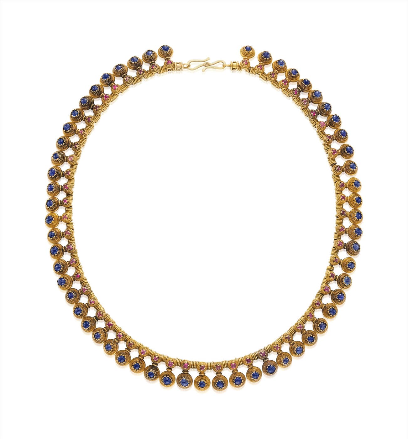 Designed as a line of cabochon rubies within textured gold surrounds, suspending similarly designed cabochon sapphire drops, mounted in 22K yellow gold, length 16 inches.
