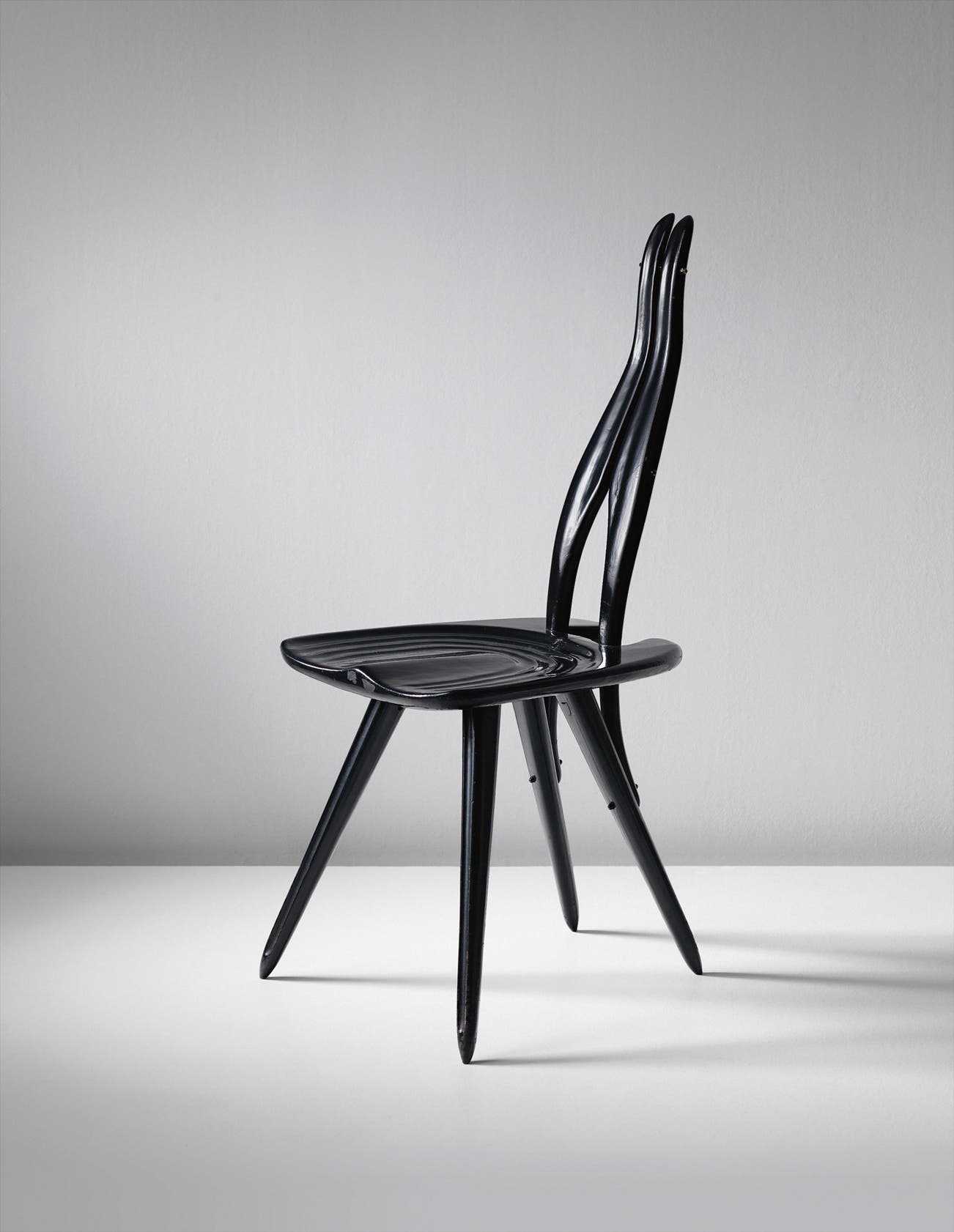 Mollino designed a set of eight side chairs for his office at the Turin Polytechnic’s Faculty of Architecture, where he was a Director. Six chairs were produced in a natural finish, of which four remain at the Polytechnic, one is in a private European collection, and the location of the sixth is unknown. Two other chairs, originally painted black, never appeared at the Polytechnic. Mollino gifted one, now in a private collection, to his friend and client Ada Minola. He installed the other, the present lot, in 1959 in his Villa Scalero garconnière, a small apartment where the chair served literally and figuratively as the support for many of his Polaroids of subsequent years.