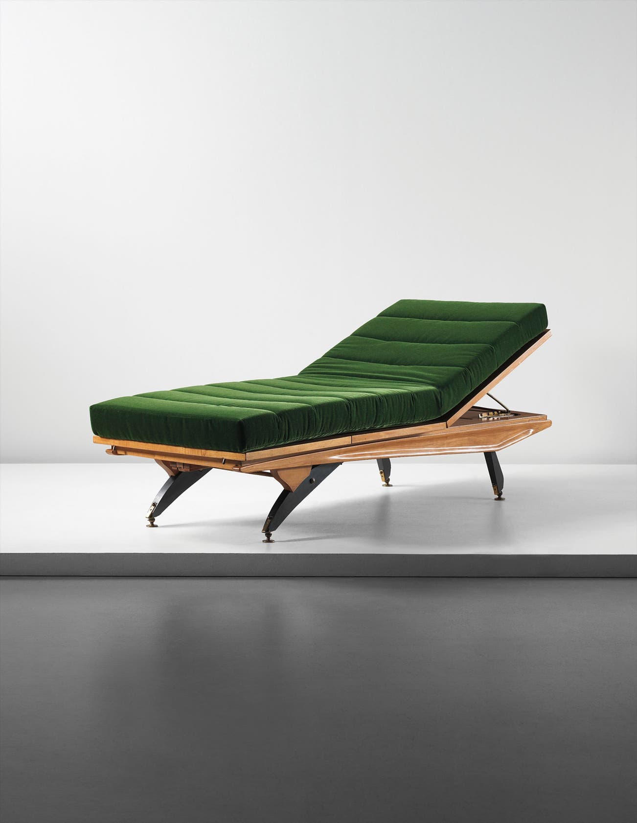 The interior of the Marquis Orengo residence, also known as Casa Orengo, was completed in 1950. Carlo Mollino conceived a large series of furniture for the river-facing apartment. The daybed was one of the main interior elements within the spacious living room, together with a large desk, table, chair, armchair, ceiling lights, large bookcase and sideboard. A similar later example of the daybed was produced for the seminal 1950 exhibition at the Brooklyn Museum, “Italy at Work.”