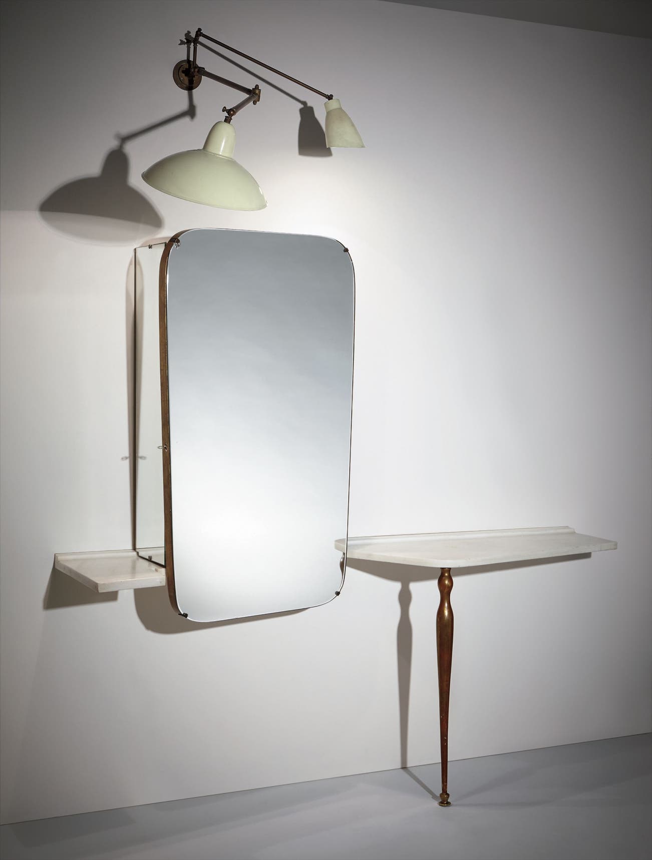 The one-legged "specchio-armadio" from the bedroom is a clear reference to baroque corner units, a connection which Mollino reinforced with the use of gilding. The structure was dealt with in a new way. The overall appearance of the unit is disjointed and free, like a sculpture. The configuration of the shelves, made of exceptionally hand-shaped marble, appear suspended while the mirrored door hides a makeup cabinet fitted with a second, smaller, “private” mirror.