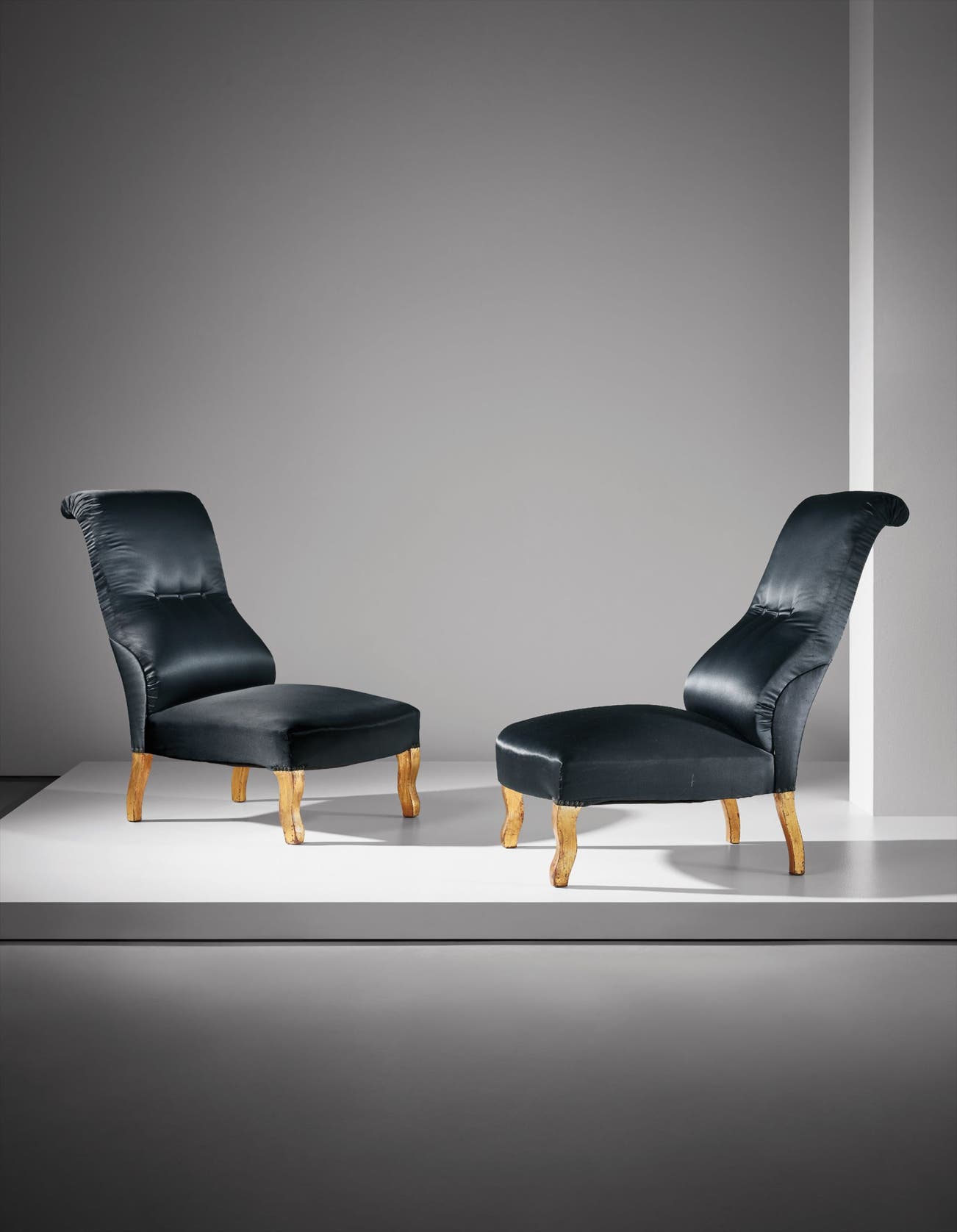 The inclusion of a pair of chairs that recall a nineteenth-century aesthetic can be attributed to Mollino’s ability to create an interior that tells a story, glorifying the relics of the family’s past (furniture, works of art, and antique rugs) always found in important aristocratic residences. The two buttons on the curved seatback upholstery evoke a pair of worried eyes, as if they belonged to a surrealist creature with golden legs.
