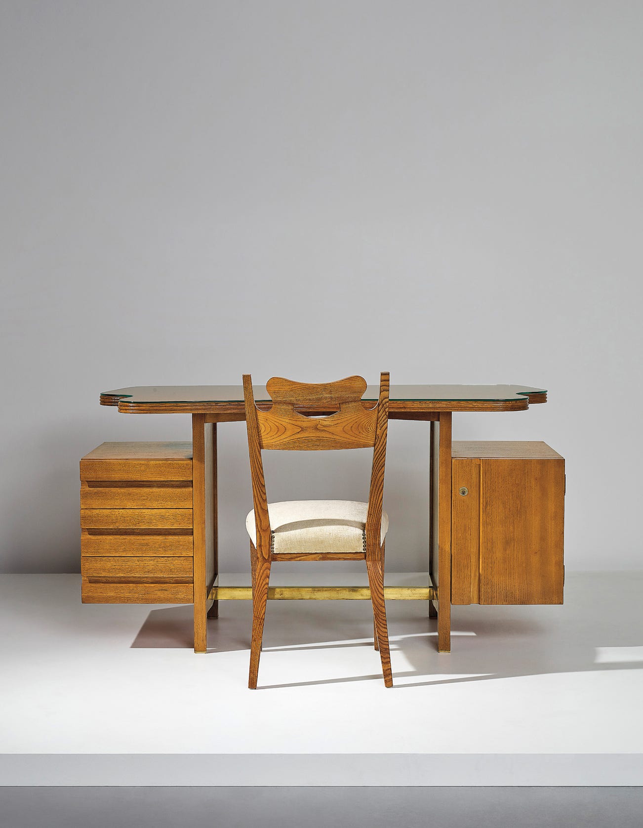 Oak, oak-veneered wood, glass, brass nail caps, brass fabric.