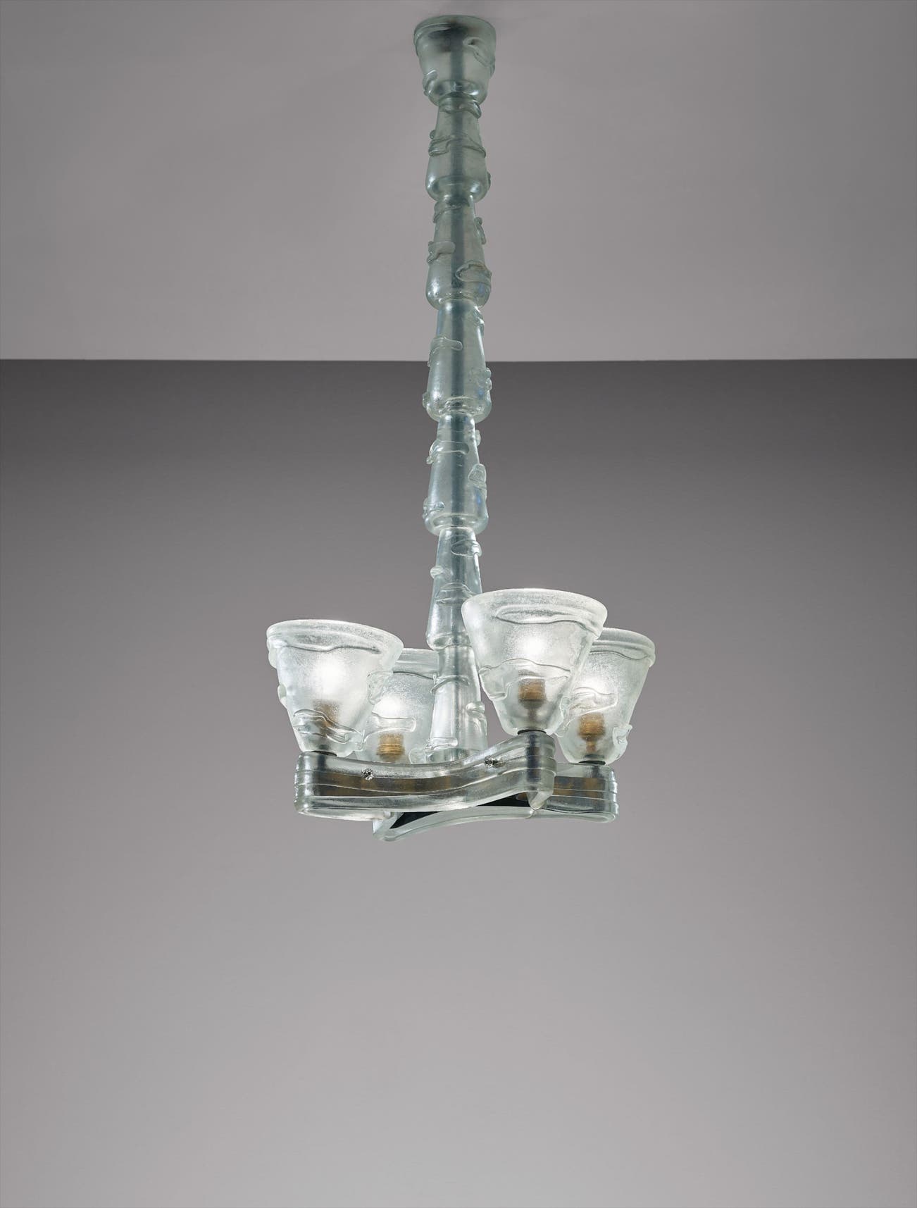 The Corroso technique, employed on the present chandelier, was first used in France at the turn of the century and introduced to Murano by Scarpa, where it became a popular and iconic technique of the highest Venini production. Corroso glass evokes the softly corroded surfaces of ancient artifacts, overlaid with a faint layer of iridescence. The effect was achieved through covering the glass in sawdust soaked in hydrofluoric and sulphuric acid. The process allowed for subtle distinctions in the texture, as the amount of acid used, the temperature and its duration would impact the result. Corroso was first presented to the public at the VI Milan Triennale of 1936 alongside a few murrine vases by Paolo Venini and a variety of ceiling lights. The Corroso technique was itself well-suited to lighting, as its texture allowed for a soft and diffused passage of light. Due to its toxicity, the technique was slowly discontinued following the Martellato series of 1938.
