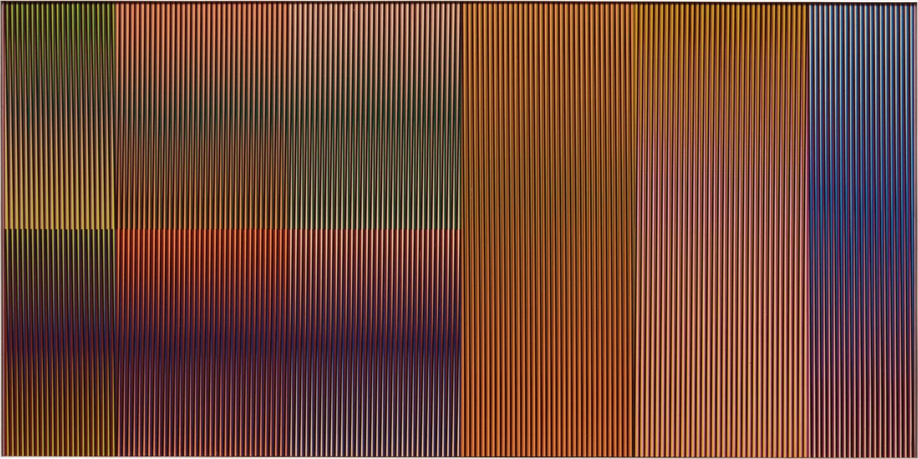 The present lot, Physichromie No. 1020 (1975), forms part of the artists most remarkable and striking series of work that he began to create in 1959, defined by the artist as “a light trap where a series of color strips interact and transform one another” (Osbel Suarez, Carlos Cruz- Diez: Color Happens, Fundación Juan, Madrid, 2009, p. 20). By gluing sheets of colored cardboard perpendicular to a stable background, these constructions produced a chromatic effect that was not only dependent on the lighting but also on the movement of the viewer. Thereupon producing a different chromatic sequence each time the spectator interacts with the piece. In 1961, the artist introduced the use of clear thin translucent sheets and in 1964 began using a template as a means of homogenizing its appearance.