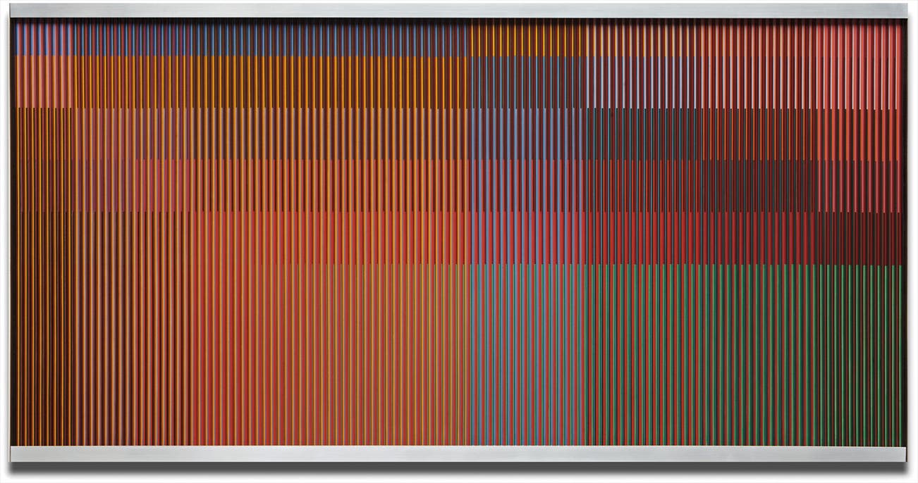 acrylic and laminated plastic strips, mounted on wood panel with aluminum strip frame