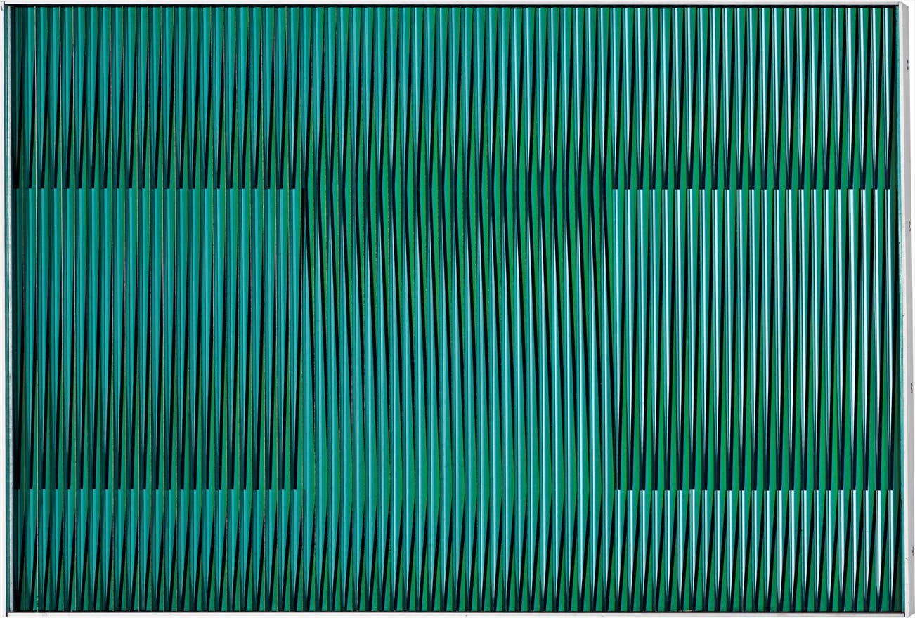 Created in 1977, the present lot represents part of a more extensive artistic investigation called Physichromies. Initiated in 1959 and concluding in 2011, Physichromies were the result Cruz-Diez’ research into color theory. The present lot is part of the fifth series of Physichromie works: The Diagonals. This composition is based on geometric patterns and repetition, and is a prime example of the artist’s refined and complex production. By projecting vibrant colors on a metal support, Cruz-Diez creates an optical experience that provokes a relationship between the art work and the spectator: the range of tones mix in the field of vision depending on the activity of the light and the viewer’s gaze and position. According to the Carlos Cruz-Diez Foundation, Physichromies are “a space where colored screens interact to create new chromatic ranges and permeate the space between the vertical sheets that cover the entire work” (Cruz-Diez Foundation, “Physichromie,”Accessed October 1, 2015). Once light mixes with the pigments on the plane, the surface is transformed, the atmosphere is enriched, and a visual phenomenon of different dimensions is created.