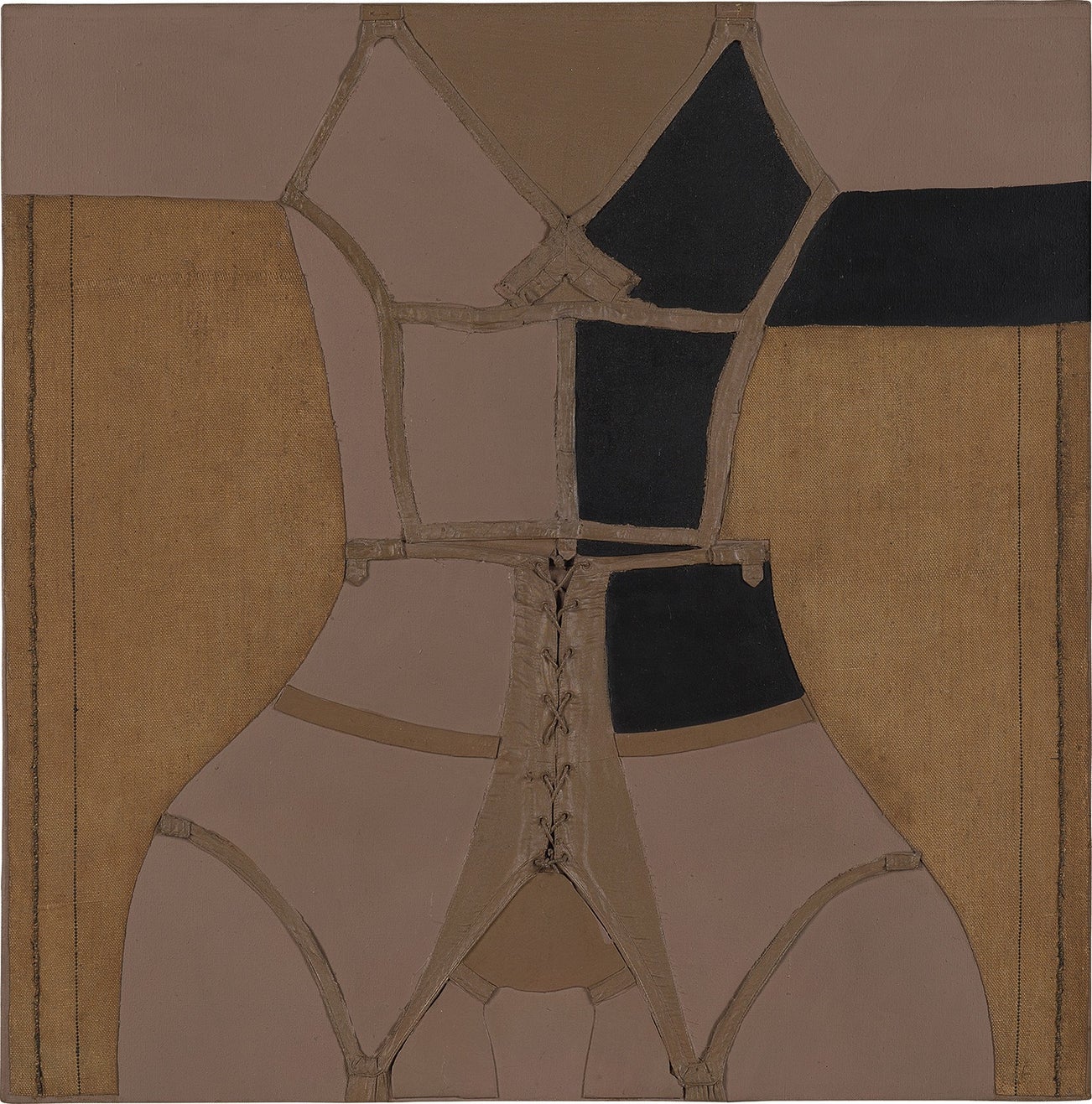 oil, painted board and fabric collage on canvas