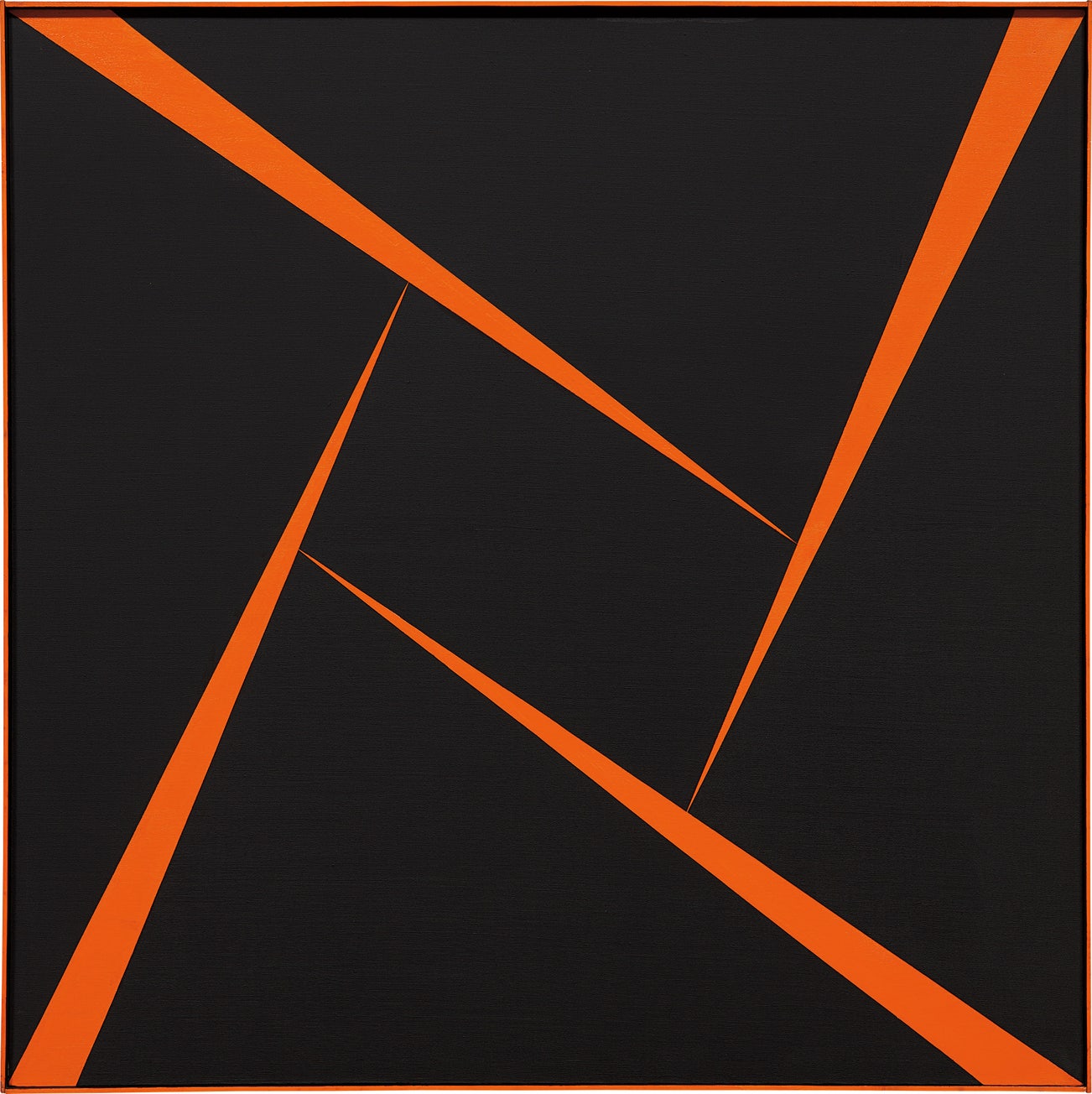 Painted in 1956, Untitled (Orange and Black) is among the first mature paintings Carmen Herrera created upon returning to New York from Paris two years prior. A remarkable example of the asymmetrical and intuitive arrangement of forms characteristic of her New York period, the dichromatic painting is testament to the modular, almost mathematical process of combining and rotating triangular forms that Herrera initiated in 1956 with works such as this one. As in Green and White, 1956, Herrera has placed four elongated triangles at each corner and oriented them centripetally with their tips pointing inward – here enclosing a rectangular shape at the center. While the interplay of geometry and color results in palpable tension that projects outside the confines of the canvas, the refined flat surface treatment in Untitled (Orange and Black) illustrates Herrera’s goal of focusing the viewer’s attention on the materiality of the work’s support structure. This emphasis on the artwork’s objectness, i.e. its status as an object hanging on a wall, is further achieved by Herrera’s groundbreaking strategy of integrating the frame into the work’s very composition, which Herrera has here painted with the same orange paint used for the triangles. Works such as Untitled (Orange and Black) exemplify how Herrera was breaking ground at the same time as like-minded artists such as Frank Stella and Ellsworth Kelly were taking up similar innovations. Sidelined as a female Cuban immigrant in the male-dominated context of the Abstract Expressionist-dominated New York art world, it is only recently, due in part to her 2016 retrospective at the Whitney Museum of American Art in New York, that Herrera has been accorded her due place within the annals of post-war abstraction.