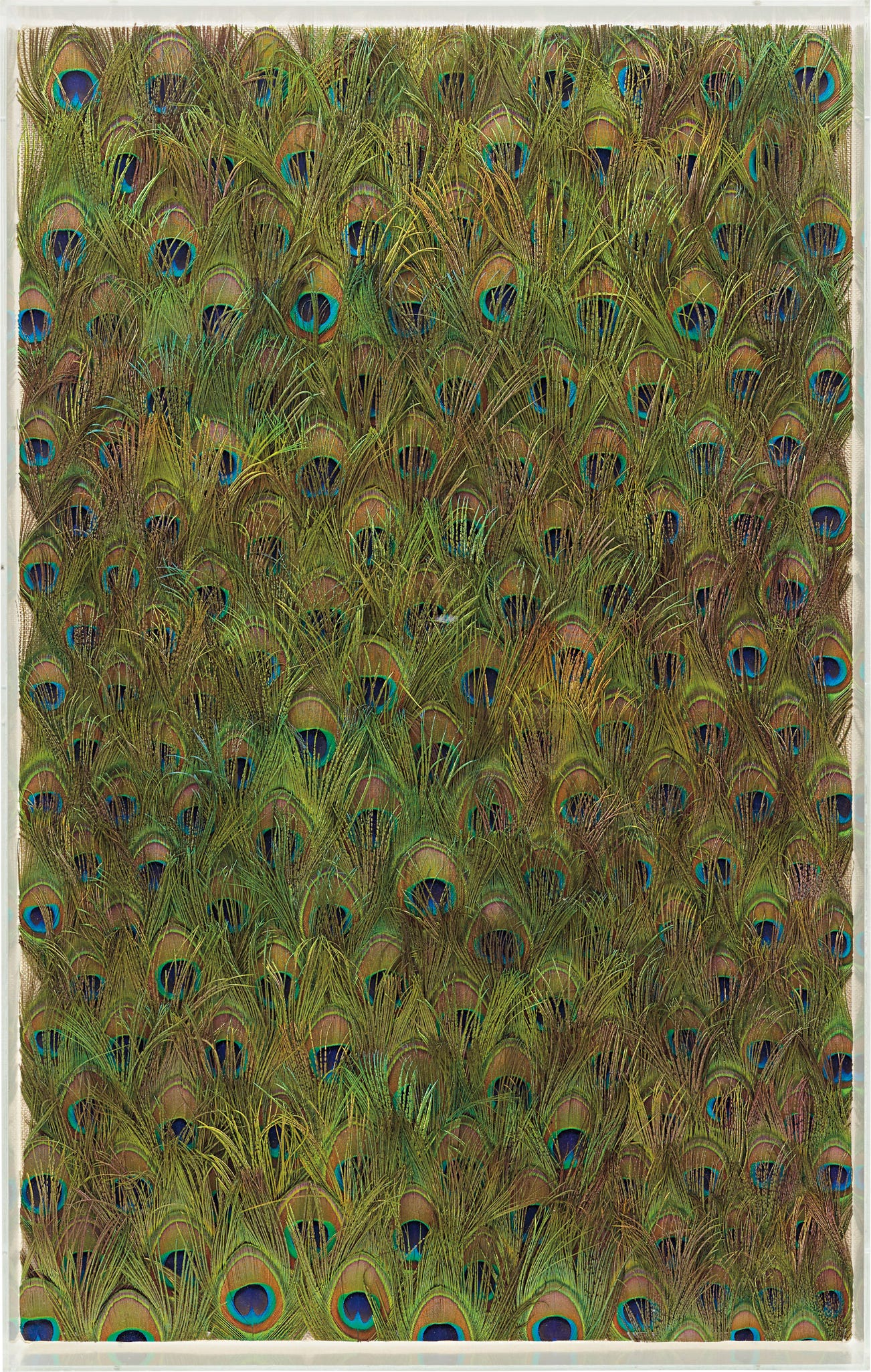 peacock feathers on linen, laid on board in artist's Plexiglas frame