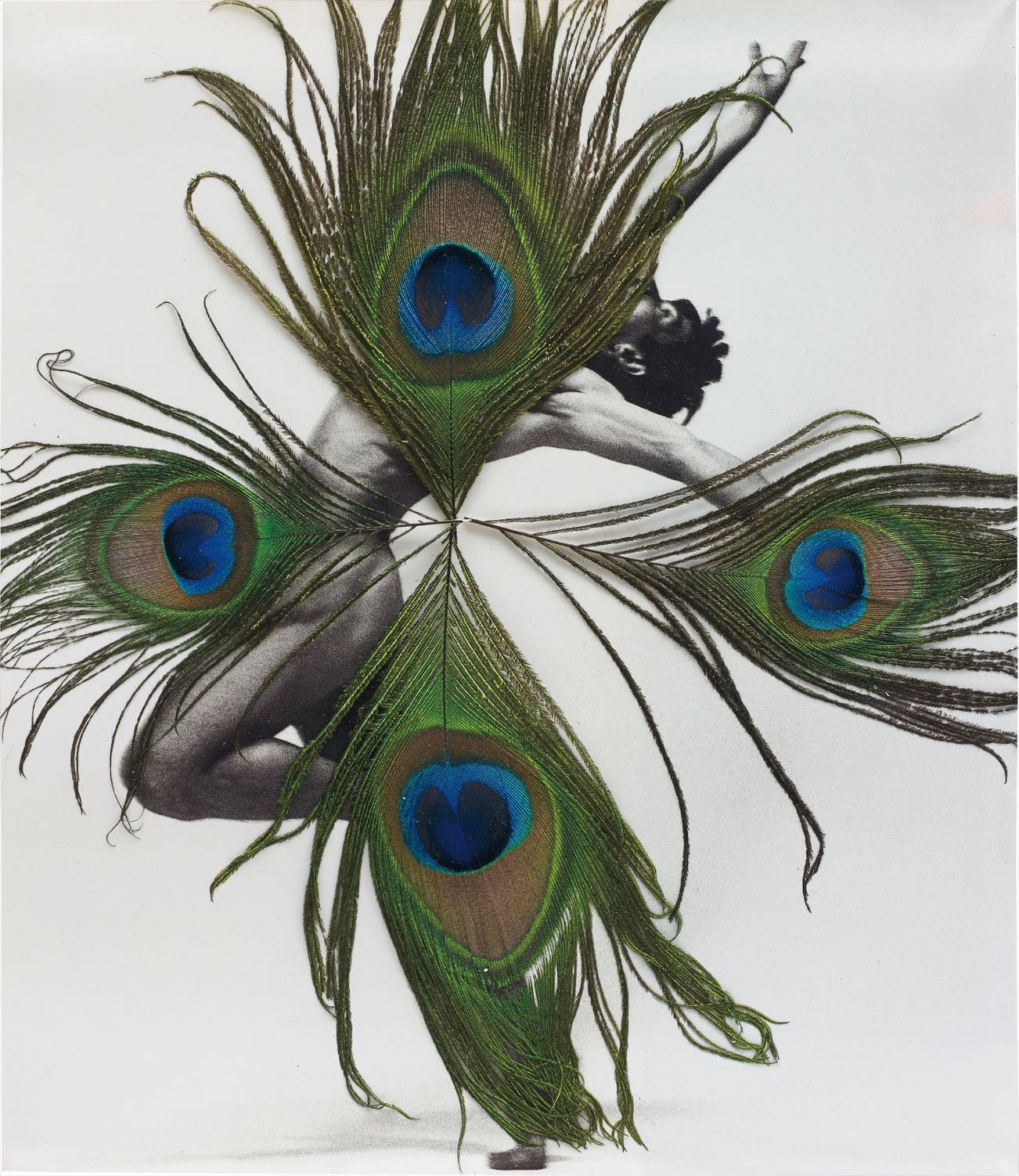 collage with a reproduction of Richard Avedon and feathers in a Plexiglas frame