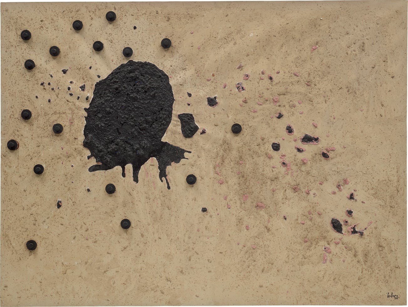 Over the course of almost eight decades, Carol Rama produced a prodigious body of work that, in its diverse formulations, eluded a single category and instead traversed figuration, abstraction, Surrealism, Minimalism and Pop. First developing a gentle figurative style in her Appassionata series – portraying hissing female characters cramped in medical appliances – Rama subsequently gestured towards abstraction, employing both organic and industrial materials to convey rawness, sensuality, imperiousness and delicacy. Cumulative and seemingly animate, Pornografia due, 1965, is a deft example of this stylistic shift, where passion becomes abstraction. Notably, the canvas was on loan at the Museo di arte moderna e contemporanea di Trento e Rovereto, and highlighted on the occasion of the artist's most important exhibition to date, La Passion selon Carol Rama, which travelled from the Museu d'Art Contemporani de Barcelona, to the Musée d'Art moderne de la Ville de Paris, the Espoo Museum of Modern Art, the Irish Museum of Modern Art in Dublin, and the Galleria Civica d'arte moderna e contemporanea, Turin, from 2014 to 2017.