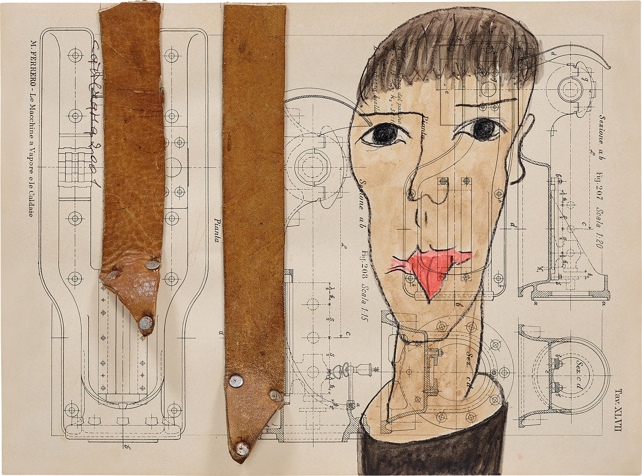 watercolour, pastel, graphite, metal and leather straps on paper, in artist's frame