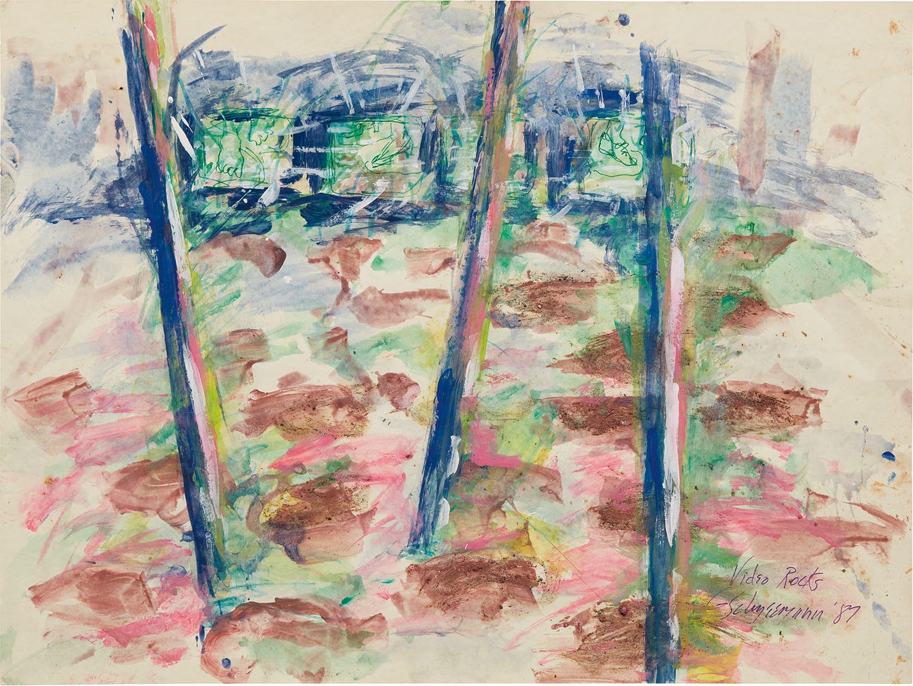 Watercolor, gouache, marker and dirt on paper.