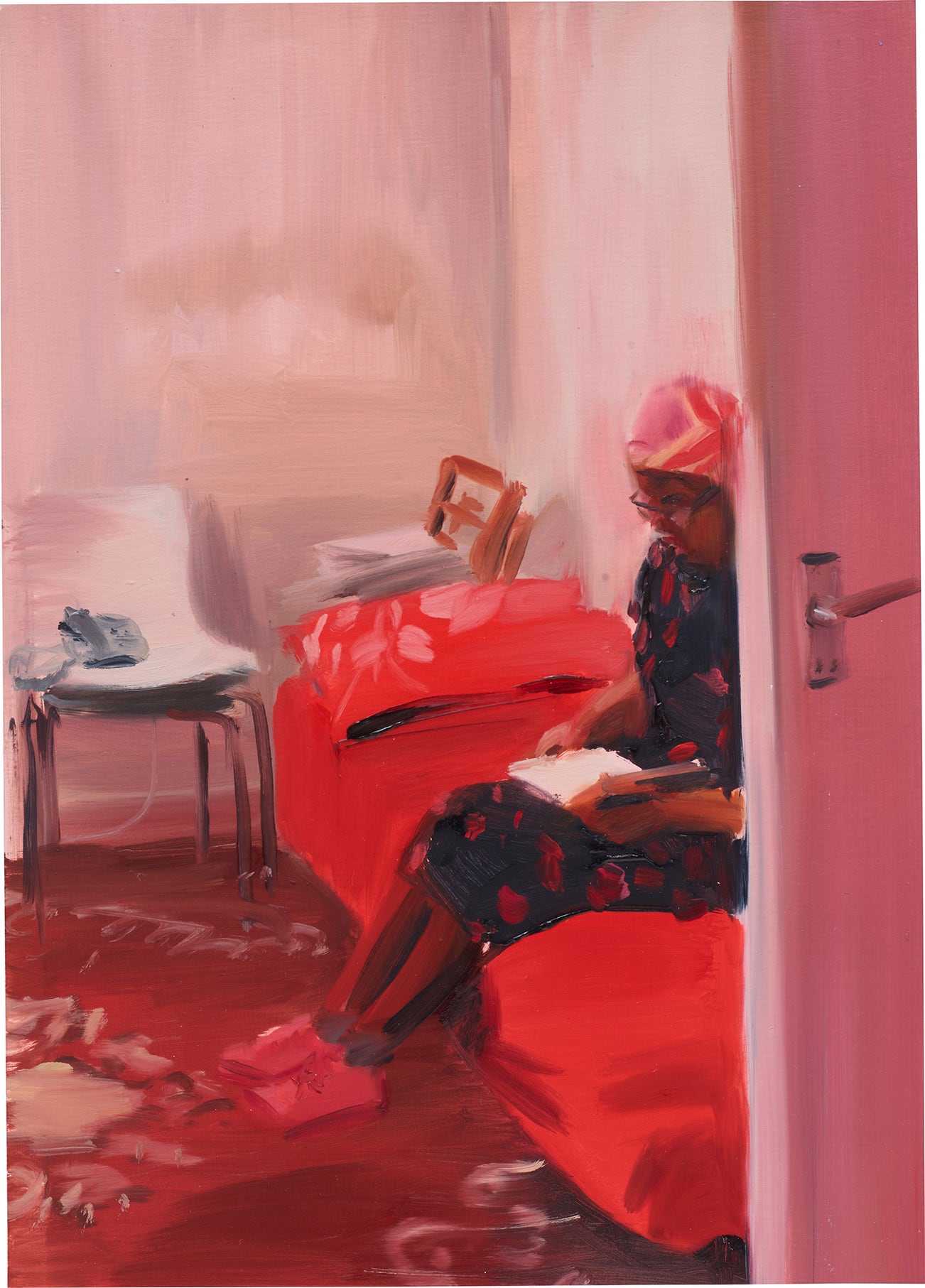 Caroline Walker’s paintings depict women in the quotidian day-to-day; adopting a documentarian approach, the artist has sought sitters at work in restaurants, shops, nail-bars or in the case of the present work, at home. These scenes combine a sense of looking into the protagonist's sphere with a deep sensitivity, in Joy, Hackney II, the work is imbued with a casual intimacy which hints at the sitter's personal narrative but does not fully reveal her story. The sitter is presented seated on a red bed, the door is slightly ajar, granting the viewer access via a glimpse into her private sphere. In this work and others, Walker makes reference to the patriarchal notions of women within the private arena. In the art historical canon, women were traditionally painted in domestic settings; in her scenes Walker disrupts narrative surrounding women within the realm of traditional portraiture through the performance of gender identity, femininity and reclaiming their representation from the male gaze.