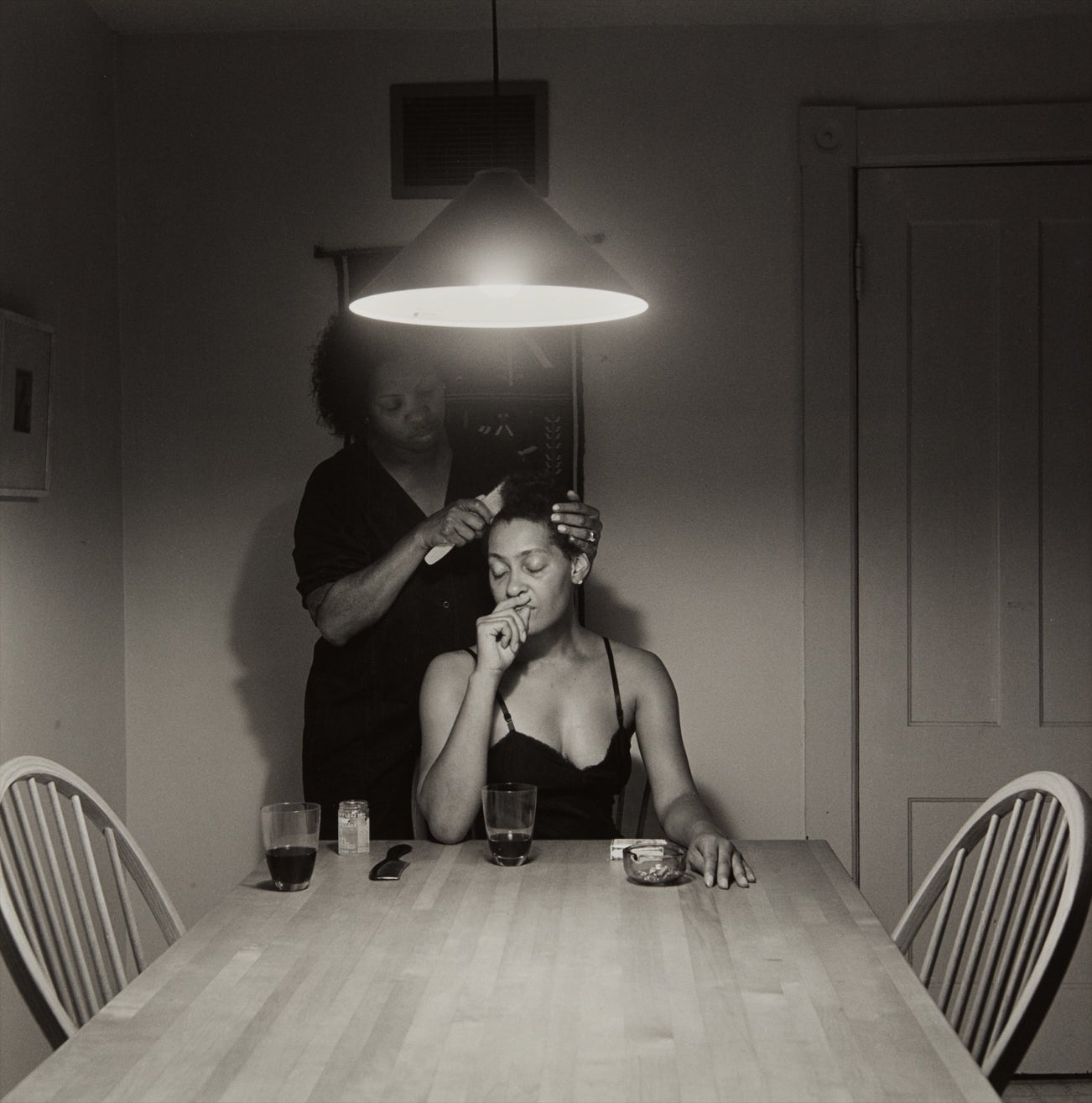 Using the kitchen table as a metaphor for the space where one’s life unfolds, Carrie Mae Weems Kitchen Table series follows a female protagonist as she navigates the stages of life, examining an array of relationships from romantic to maternal and, as we see in the present lot, platonic, all whilst seated at the table. Reflecting on the seminal series, Weems spoke to the significance of the domestic setting: “That's the space. Everything gets resolved in that space. It's a beautiful piece really, you know. It's so simple in its construction. It's so minimal. There's a table, there's a lamp, there's a chair. There's a man, there's a woman, there's a girl, there's a child. Maybe there's a glass of wine and a couple packs of cigarettes. That's it. It's very bare bones.”