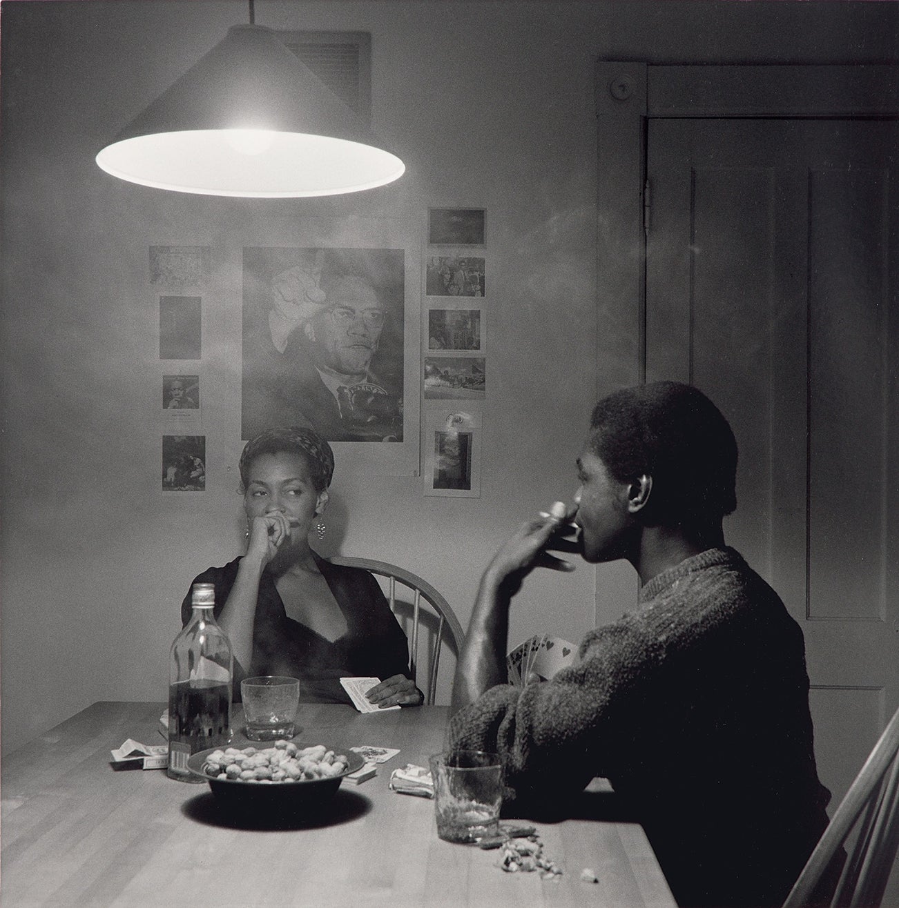 Carrie Mae Weems’ acclaimed Kitchen Table Series depicts the life stages and relationships of a female protagonist, played by Weems herself. In these constructed tableaux vivants, Weems uses the table as the anchor for her heroine’s life story; the site at which she embraces her partner, engages with her daughter or sits alone in contemplation. In the present lot, Weems’ character is seated alongside a male counterpart, the scene imbued with the weight and complexity of their relationship as they eye each other over their card game. By embracing the role of both sitter and photographer, Weems powerfully embodies the nuanced representation of African-American women that she found lacking in the public discourse.