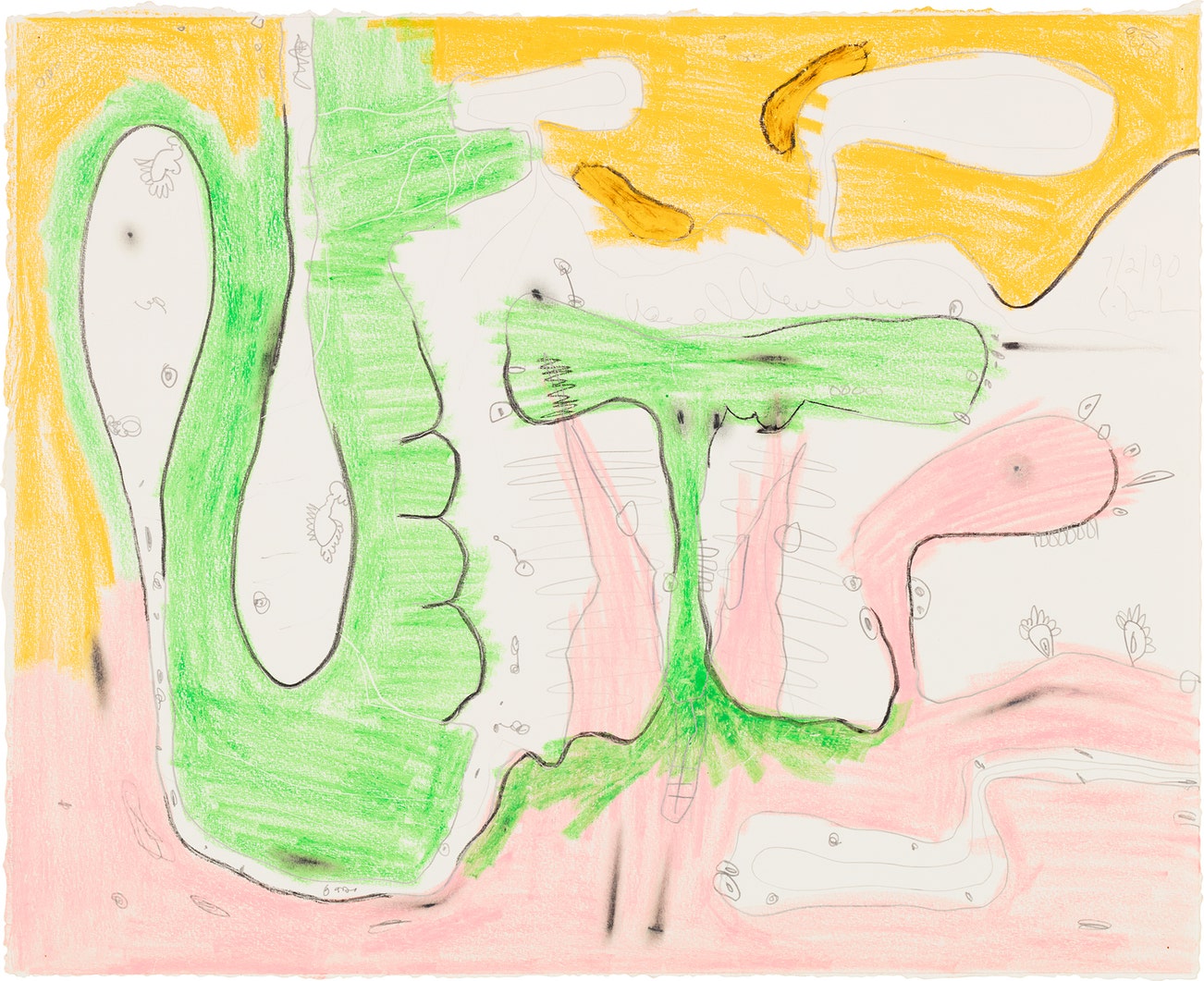 American | 1949Satire and sexuality meet Carroll Dunham's vivid brush in the artist's often large-scale fantasy worlds. His eye-popping cartoonish veneer takes a cue from Philip Guston while his primitive "visual language" of faceless figures continues a long line of tradition—think back to Paul Cézanne and Pierre-Auguste Renoir.