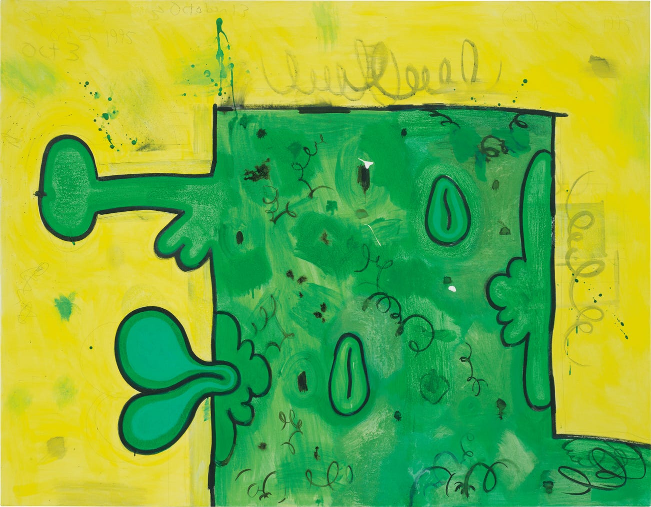 Dated "Sept 26, 27 Oct 2 1995 Oct 3 October 13" upper left; further signed and dated "Carroll Dunham 1995" upper right; additionally signed, titled and dated "Carroll Dunham 1995 NYC 'Green Box in a Yellow Field'" along the stretcher.