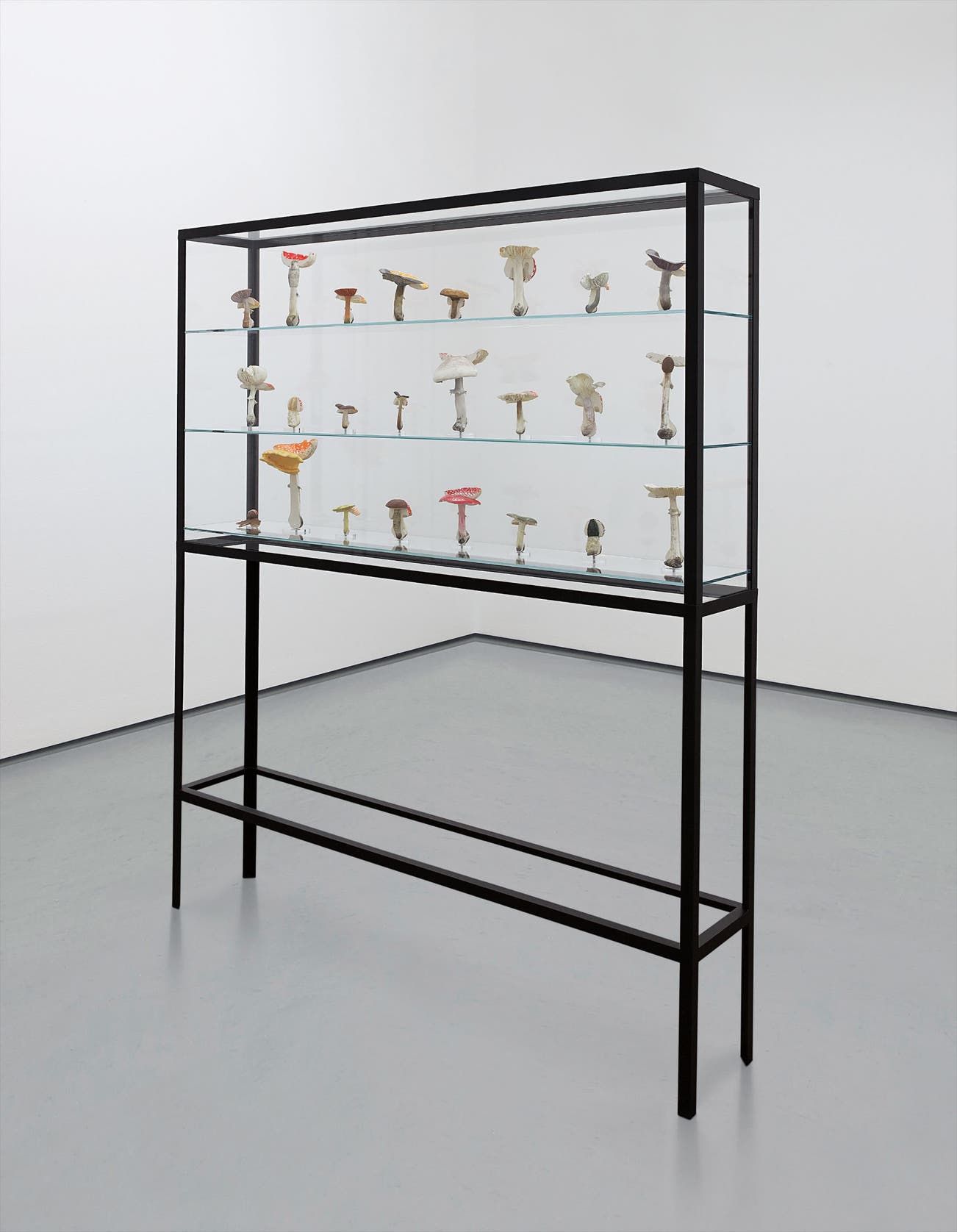 24 polyurethane and acrylic mushroom replicas in vitrine
