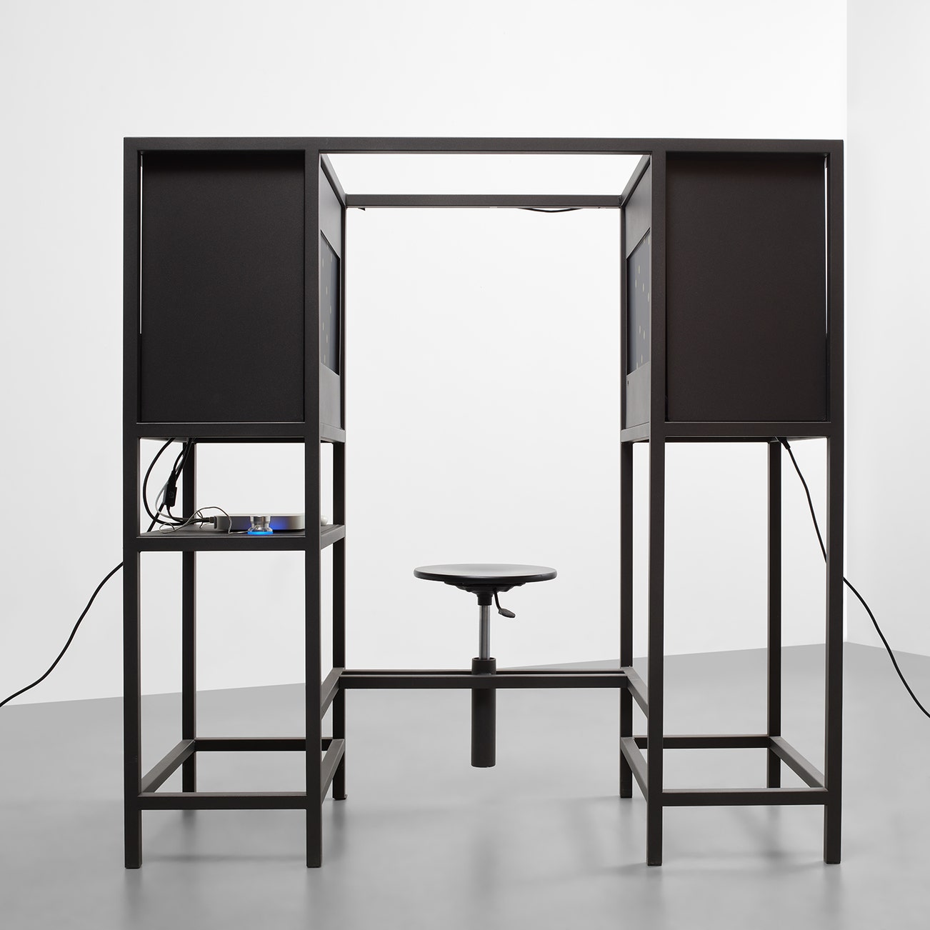 2 TV monitors, 1 laptop, electric cables, adjusting knob and swivel chair in a powder-coated steel sculpture