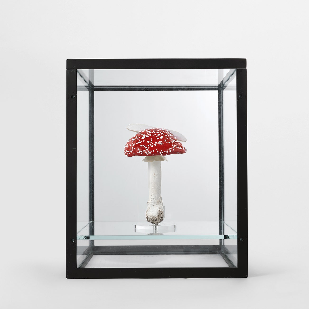 cast polyurethane mushroom replicas in various sizes, acrylic paint, glass discs, metal pins, vitrine glass, powder-coated metal framework