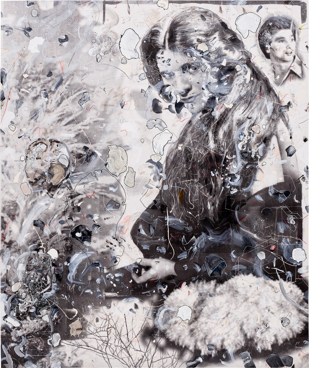 digitally altered, folded and defaced laser prints, acrylic ink, oil, gel medium and paper collage on canvas
