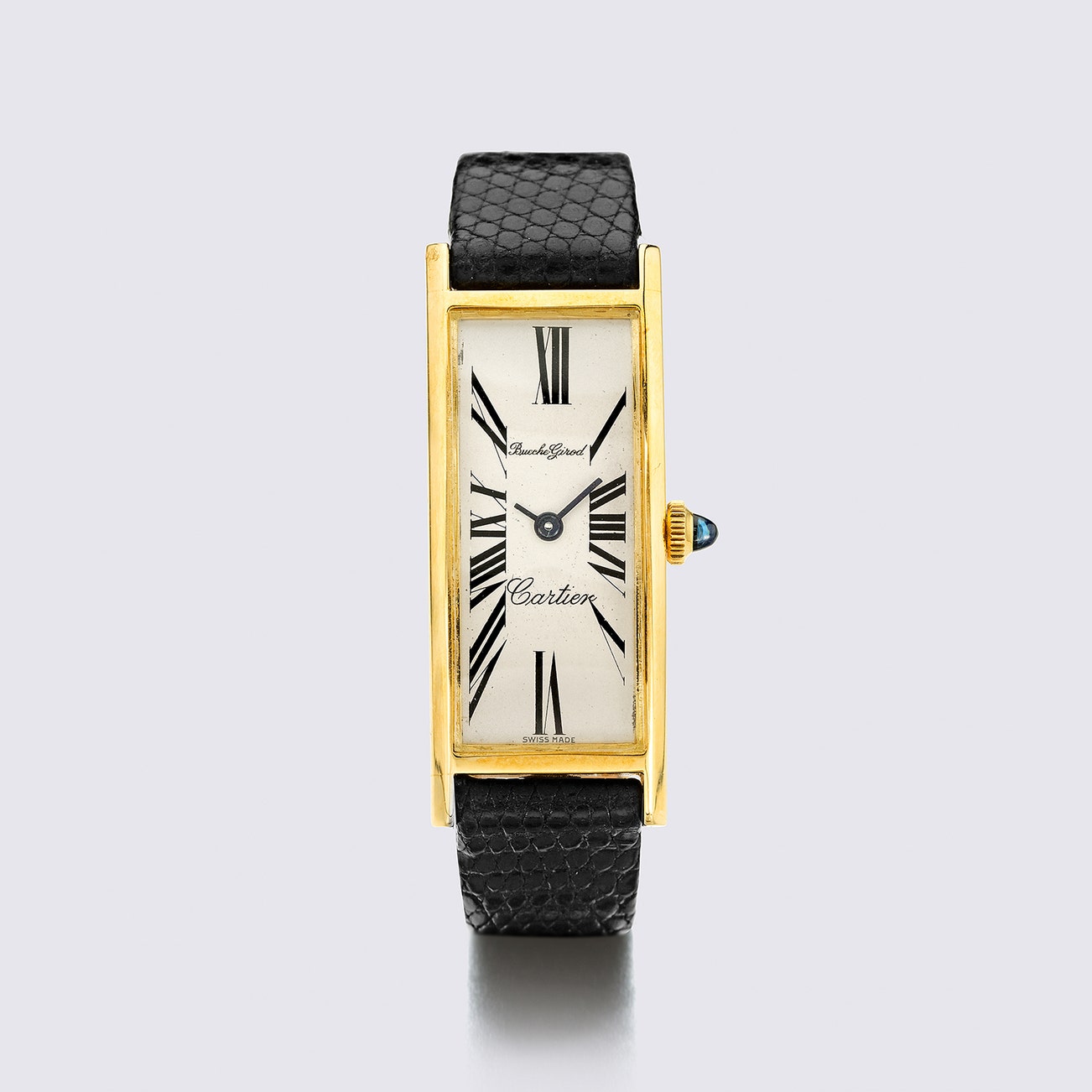 The ivory color dial with painted exploded numerals and double signatures, within a yellow gold bezel and curved case measuring approximately 17 x 42 mm, completed by a genuine lizard leather band and a pin buckle, mounted in 18K yellow gold, manual wind movement, inner circumference approximately 5 to 7 inches, signed Cartier and Bueche Girod on dial, numbered, with Swiss hallmark. Accompanied by a singed box.