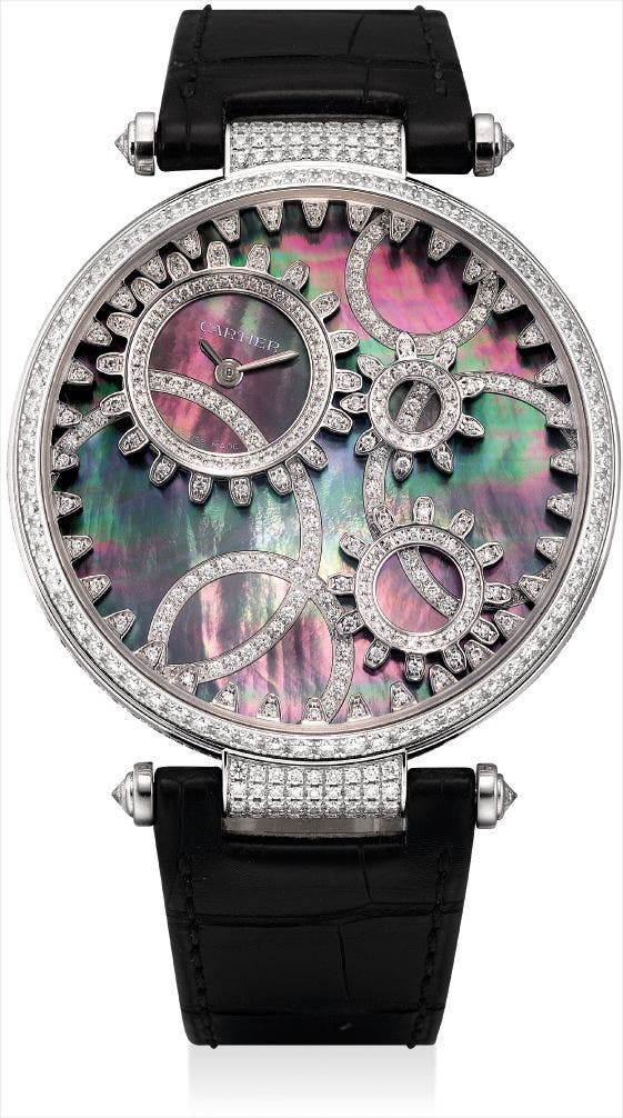 A lady's very fine and unusual white gold and diamond-set wristwatch with mother-of pearl and diamond-set gearwheel decorated rotatable dial