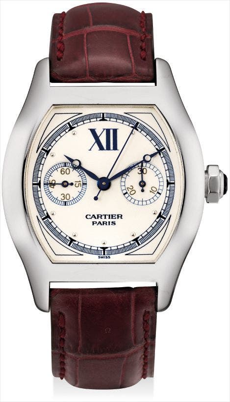 A fine white gold tonneau-shaped single-button chronograph wristwatch