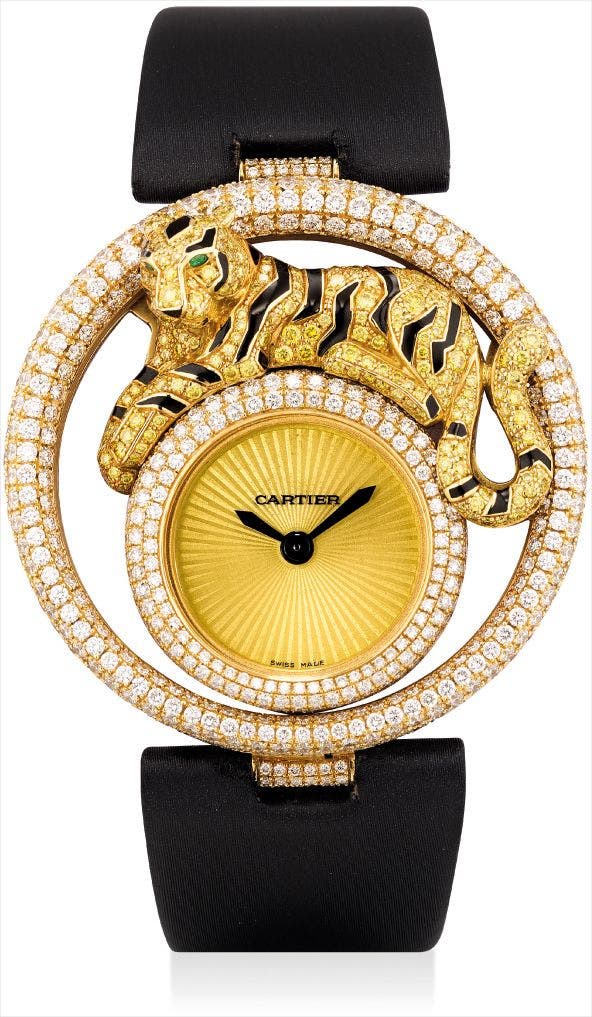 All references were created in a limited edition series, and were exceedingly difficult to obtain. The present watch, fitted with a tiger, is crafted using yellow diamonds, diamonds, enamel and emeralds which represent the eyes. The tiger is suspended between two circles held between sapphire crystal. The bezel and band are furthermore adorned with brilliant diamonds, presenting a three dimensional viewing experience. The watch is furthermore numbered 7, from a limited edition series of 50 pieces, and is presented with its original certificate and accompanying accessories.