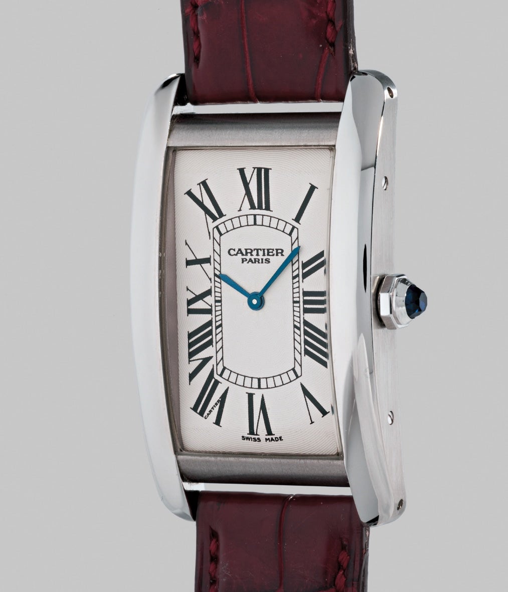 Inspiration comes from the most unusual object, as Louis Cartier designed this watch with the first Renault tanks in mind. Legend has it that the first examples of the Tank watch were offered by Cartier to General John Pershing of the American Expeditionary Force. The present lot, known as the Tank Americaine, is a direct descendant of the original Tank. It’s a noteworthy model within the Tank’s distinguished lineage since it features a mechanical movement placing this model amongst watches designed for true watch lover. Made in platinum, its white guilloché dial displays Cartier’s traditional Roman numerals featuring a secret signature at 7 o’clock. Presented in superb condition, the case retains its perfectly crisp mirror and satin finish. This watch represents a fantastic addition to any collection of iconic timepieces.