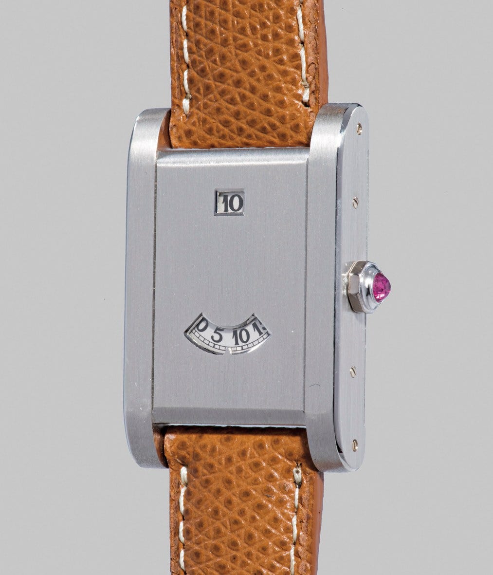 The present watch is a limited edition of 150 examples to celebrate the 150th anniversary of Cartier in 1997, with the case back engraved "1847-1997" below the "LC" logo. A re-edition wristwatch of the historical Tank à Guichet model, its cased in platinum, which is very heavy and gives incredible presence on the wrist. The unpolished case furthermore displays a combination of brushed and polished finishes, showcasing Cartier's superior craftsmanship.