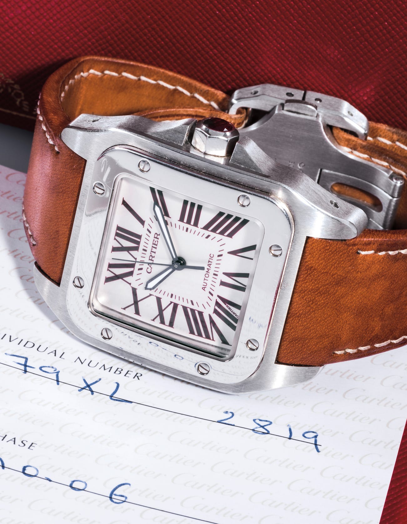 It is believed that the present watch was offered exclusively at the Paris Cartier Boutique, with only four examples cased in platinum in total. This example, featuring red numerals and a ruby crown, was made in two pieces only, with the other two pieces featuring blue numerals a sapphire crown. Most Santos wristwatches feature the numerals in black, making this watch incredibly striking and unusual.