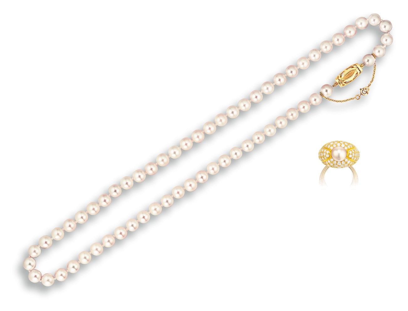 A Cultured Pearl Necklace, and A Cultured Pearl and Diamond Ring, Cartier