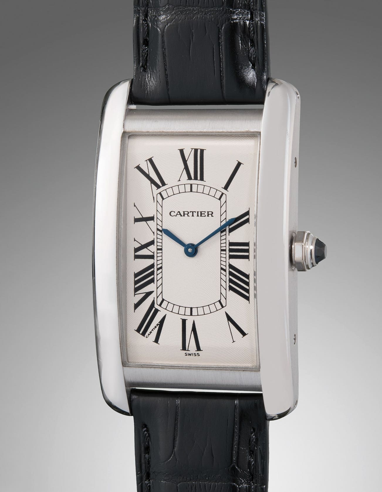 The present example is in excellent overall condition with a crisp case and its original factory finish. The white guilloché dial displays Cartier’s traditional Roman numerals and secret signature at the 7 o’clock. Accompanied by its original international guarantee certificate, this is an exciting opportunity for all collectors to own a noteworthy variant of the famous Tank that has been worn by kings, queens, and the Hollywood elite for decades.